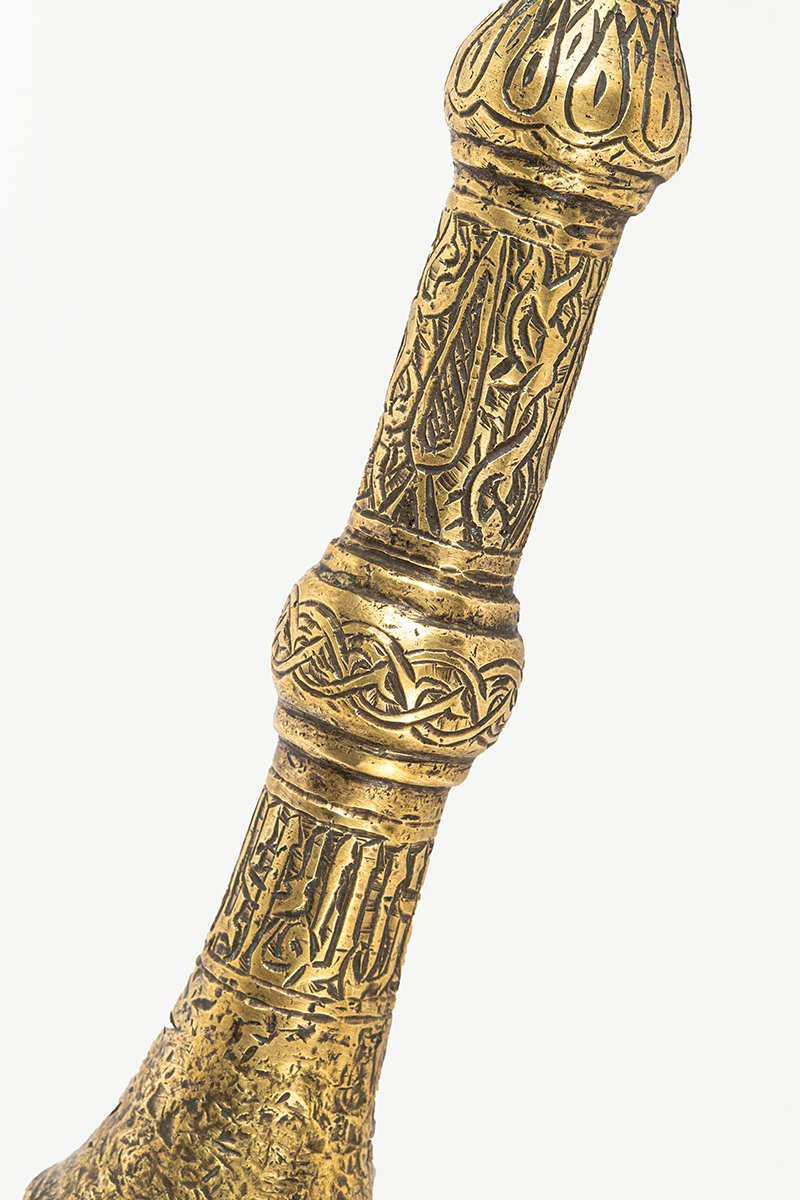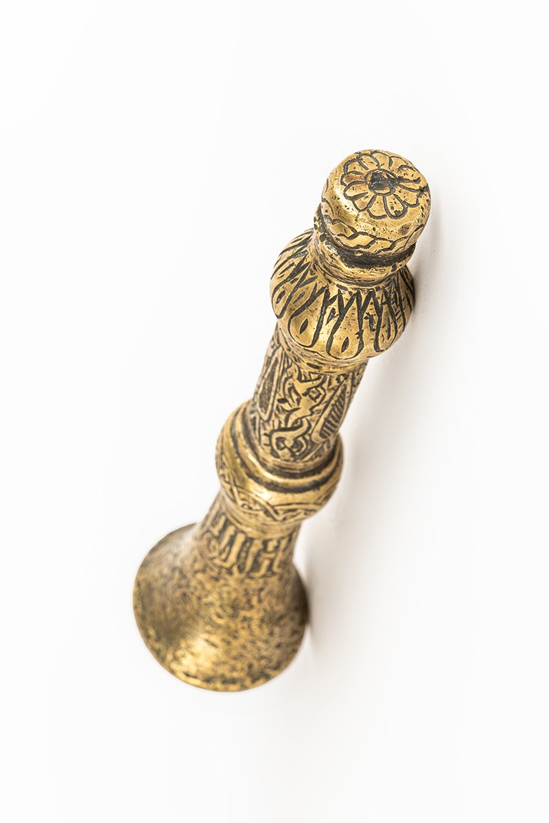 - Pestle: The flared pestle is engraved with interwoven arabesques, calligraphy, and floral medallions, matching the vessel in artistry.