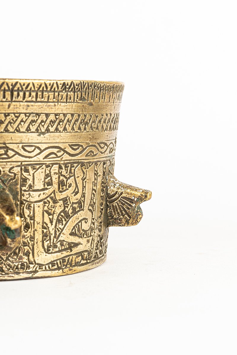 - Mortar Body: The wide cylindrical vessel is adorned with geometric interlace and calligraphic bands, binding symmetry with royal proclamation.