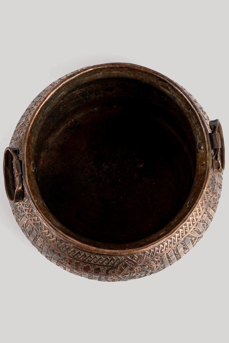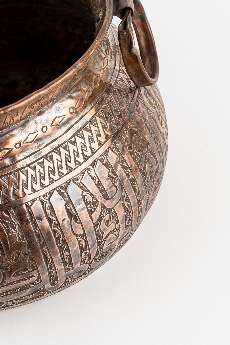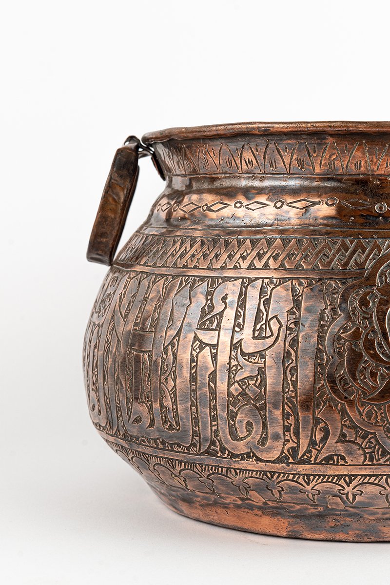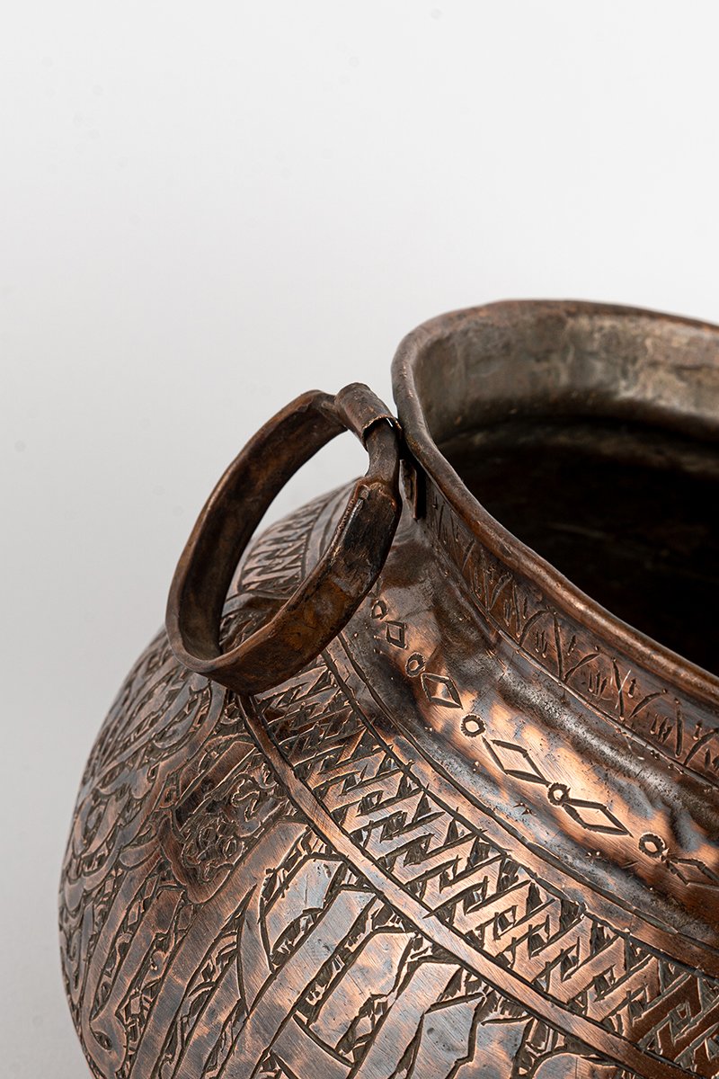 This vessel reveals its story slowly, through weight, proportion, and surface detail. Forged in copper with engraved ornament, its rounded body and broad twin handles convey both strength and ritual presence. Every element, from calligraphy to floral geometry, marks it as an object of endurance, artistry, and symbolic meaning.