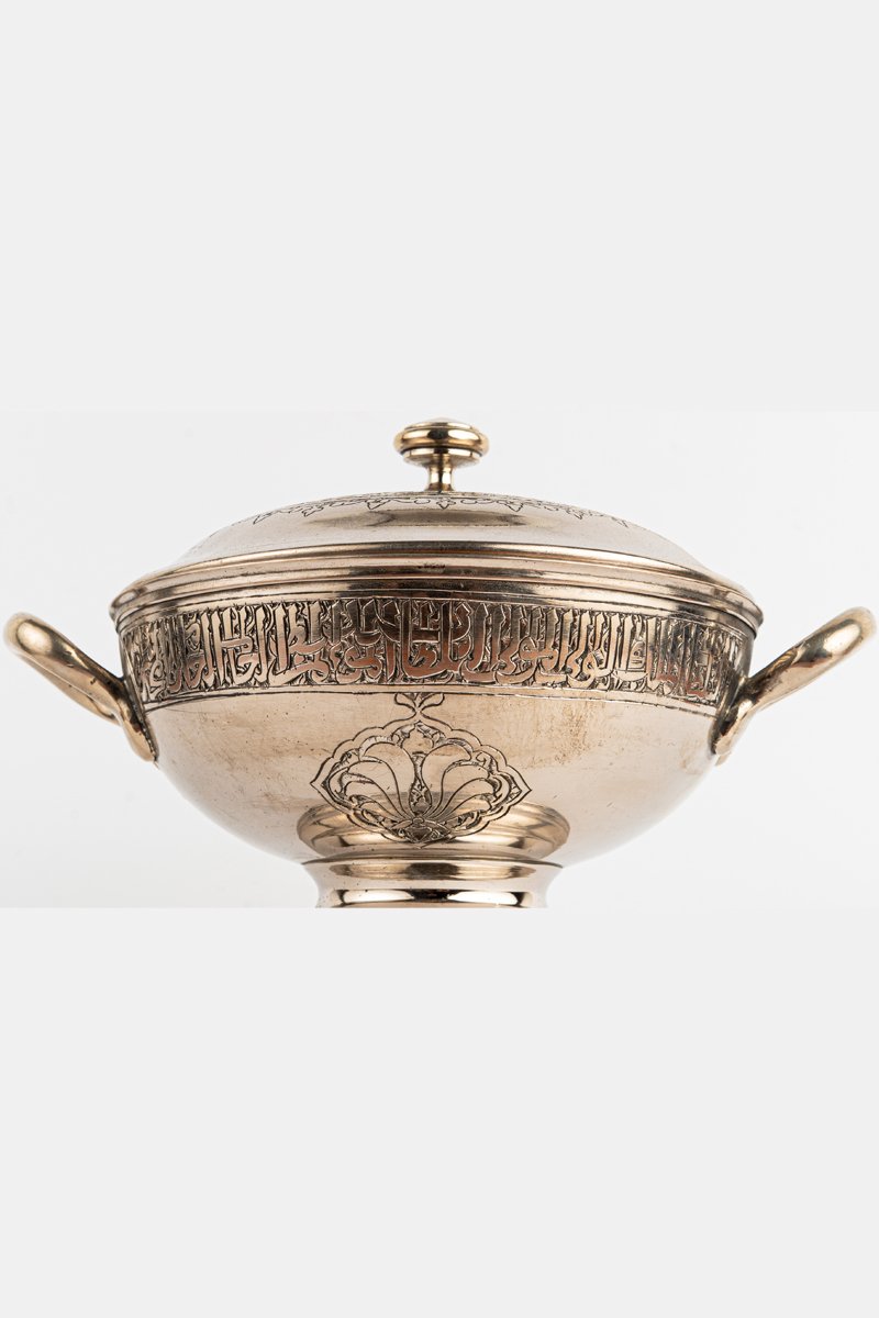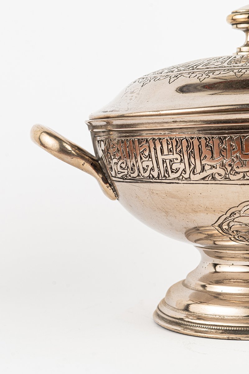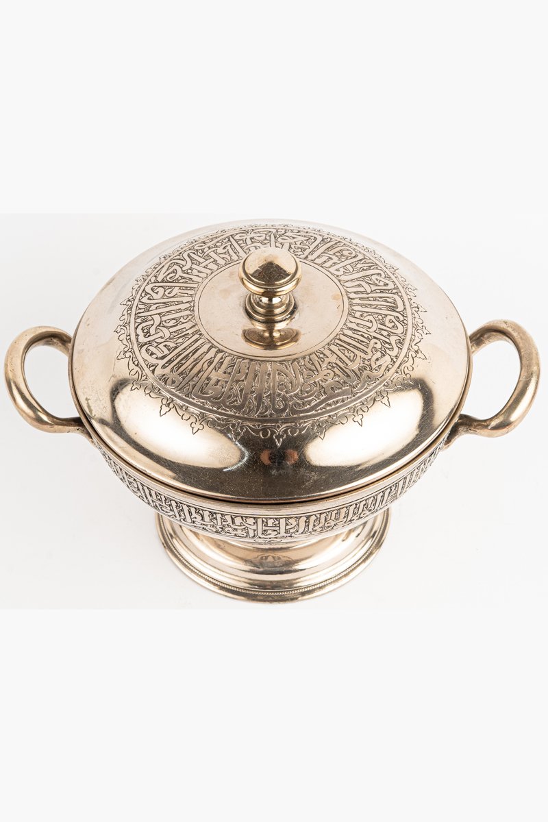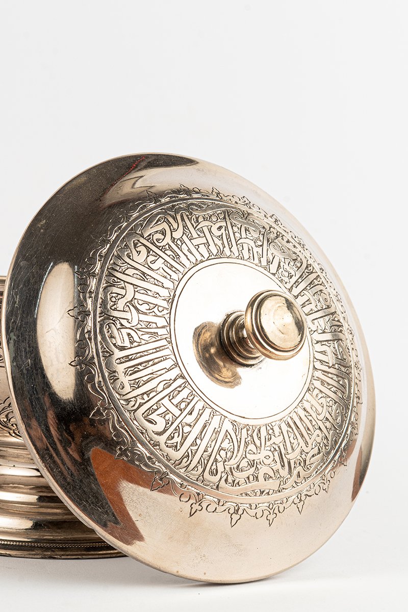 - Lid & Finial: The rounded lid is crowned by a smooth finial, surrounded by a radiant band of inscribed calligraphy.