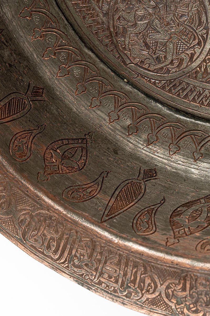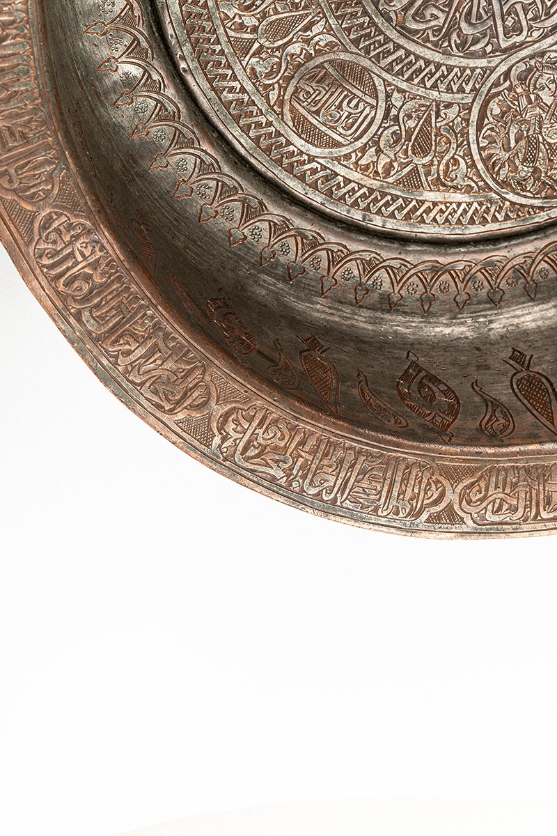 This basin is a masterwork of Mamluk metalwork, its surface alive with layers of geometry, calligraphy, and figural scenes. Crafted in darkened bronze with copper highlights, it radiates both artistic refinement and martial authority. Its inscriptions and imagery transform the vessel into a proclamation of rulership, faith, and cosmic order.