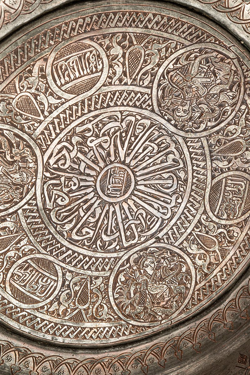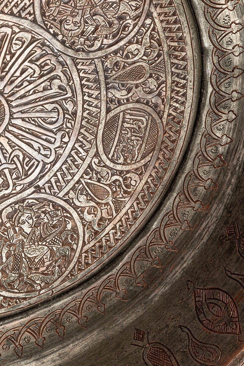 This basin was far more than a utilitarian object: it is a ceremonial proclamation in metal. The sunburst conveys divine blessing, the knights embody courage and guardianship, and the calligraphy affirms Sultan Baybars’ authority as both just ruler and victorious commander. Through its harmony of geometry, figural imagery, and sacred text, the basin stands as a meditation on power, piety, and eternal order.