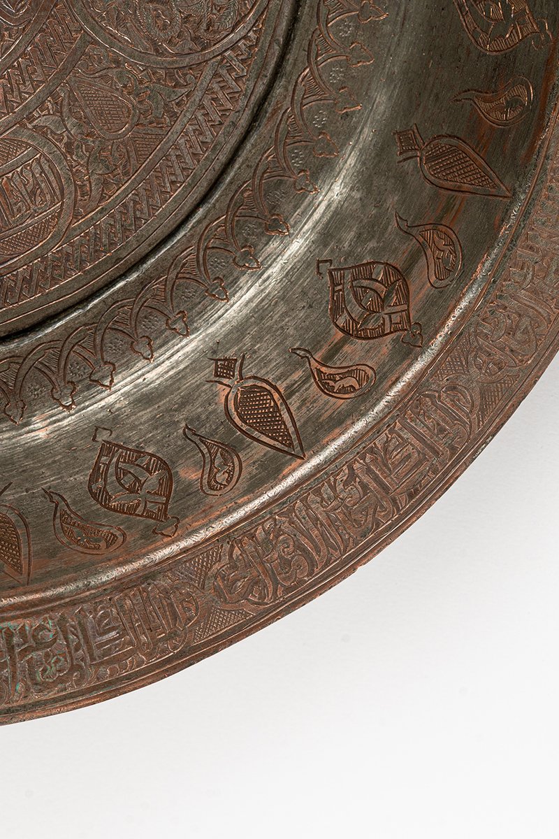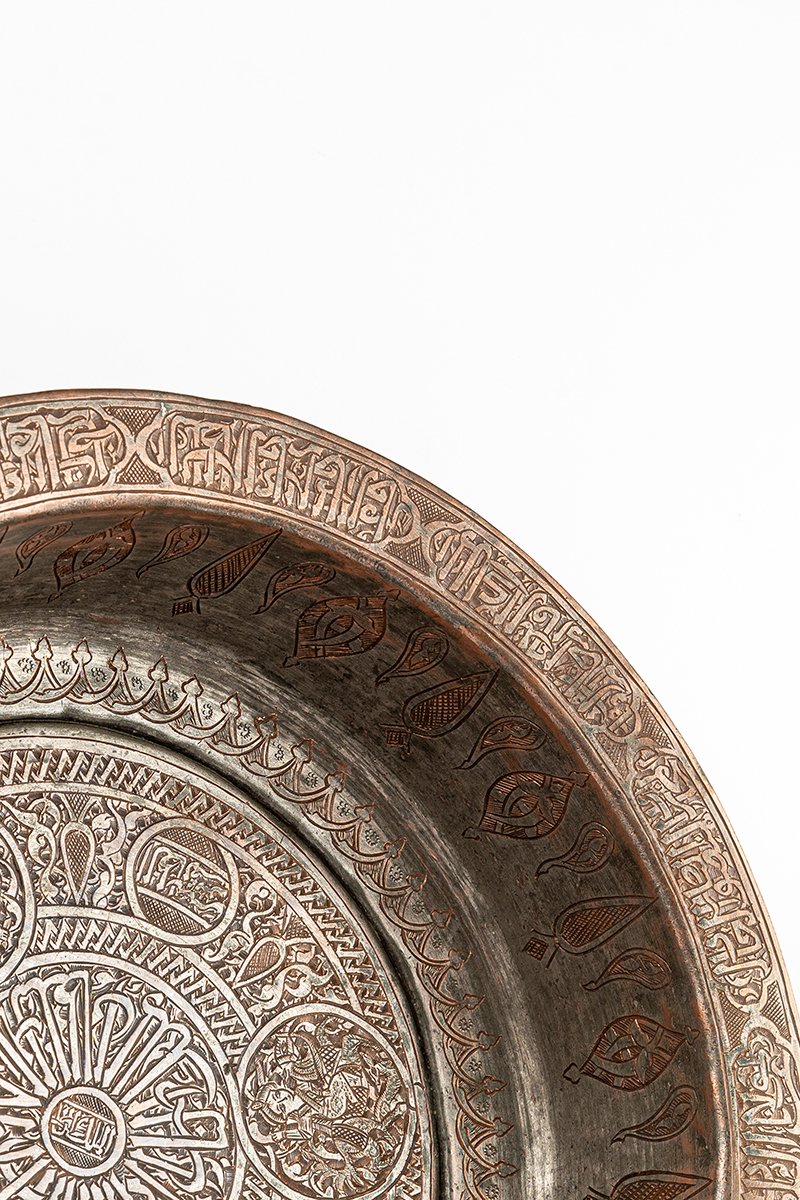 - Outer Script Band: A wide border of continuous calligraphy encircles the rim, forming a halo of praise that transforms the basin into an endless prayer.