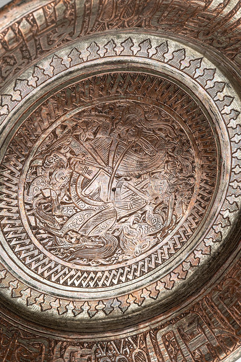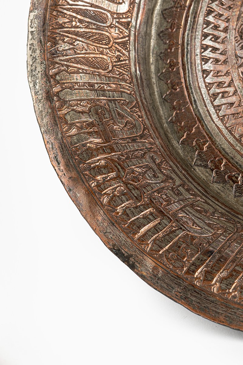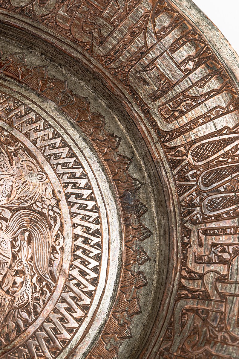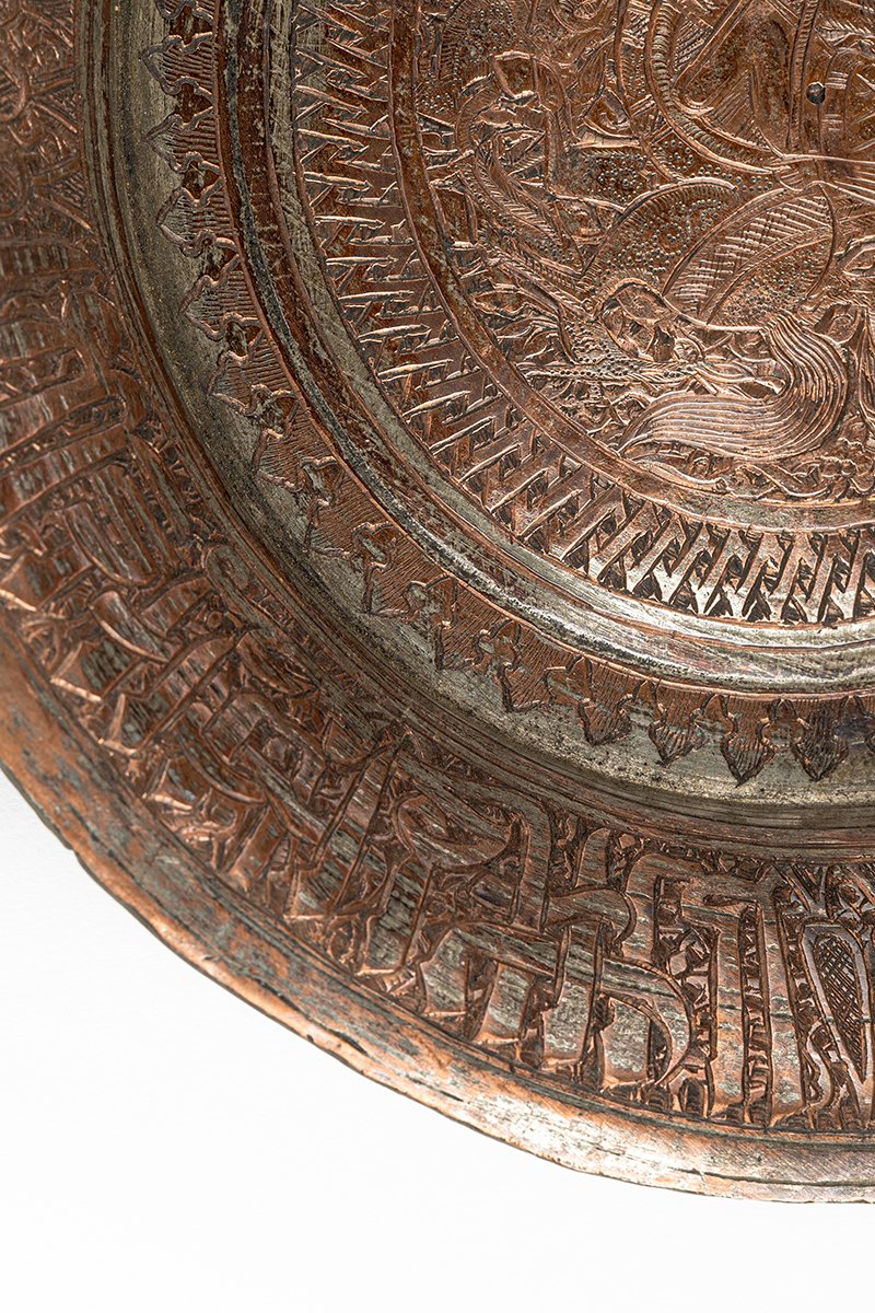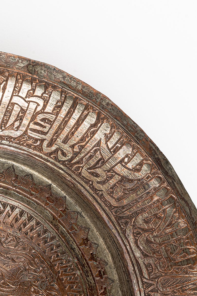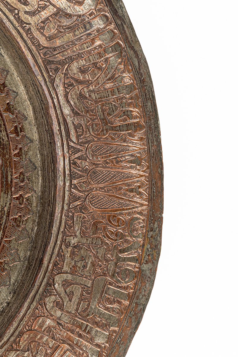 This engraved copper dish is a refined example of Mamluk metalwork, where narrative figuration and sacred calligraphy intertwine into a surface of power, artistry, and devotion. Its composition balances the immediacy of a warrior scene with the abstraction of geometry and inscription, transforming a vessel into a proclamation of rulership.