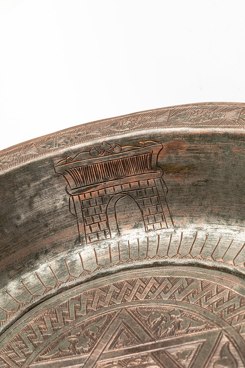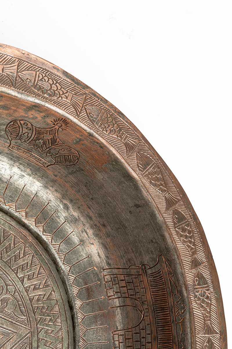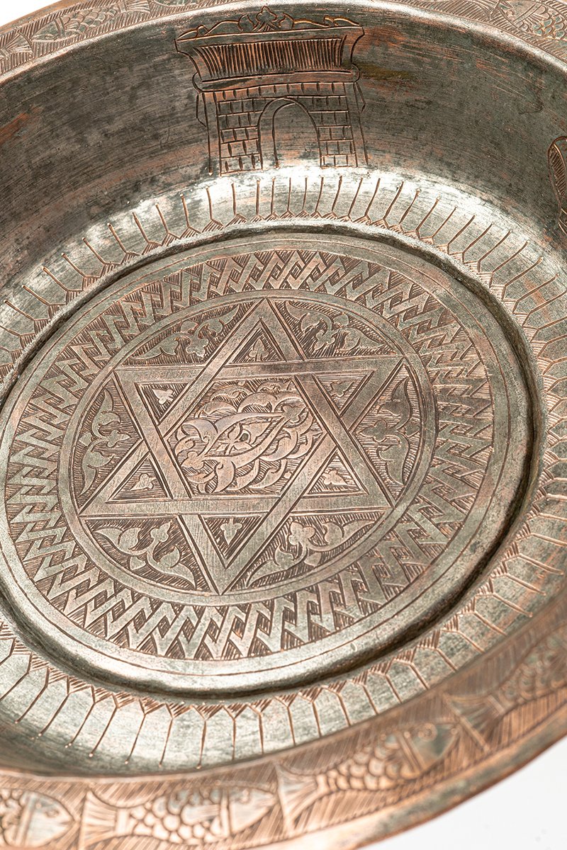 This basin is not merely a vessel for water or offerings; it is a microcosm in metal. At its center, the star and rosette symbolize unity and cosmic balance. Around them, flames, crowns, gates, and fish embody light, power, passage, and abundance. The protective geometry at the edge holds the cosmos intact. In this vision, the basin becomes a mirror of harmony, binding the celestial with the earthly, the sacred with the utilitarian.