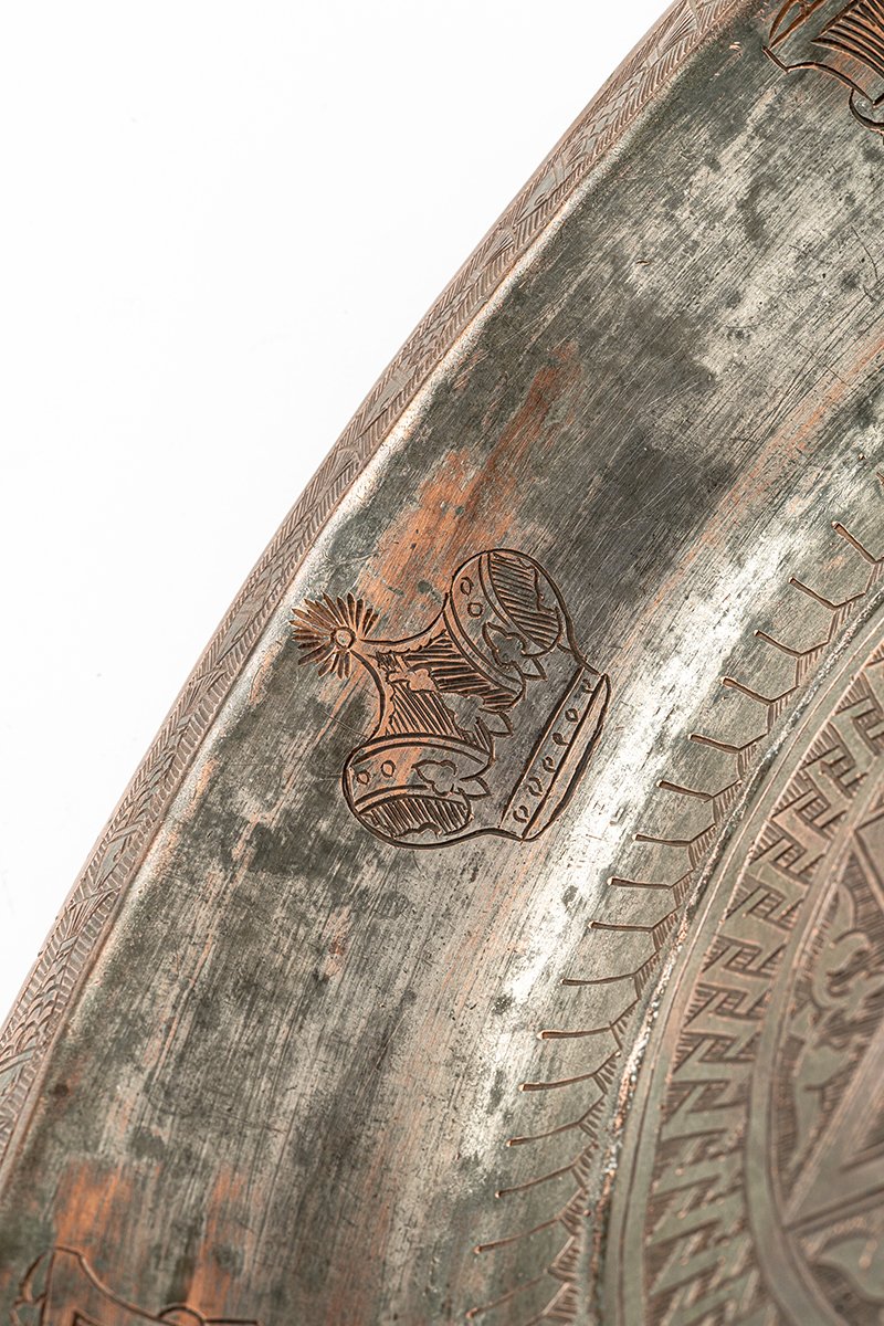 This deep basin, worked in engraved bronze, is a vessel of layered symbolism where geometry, fauna, and regal emblems merge into a vision of cosmic order. Its broad surface and expansive rim transform utility into proclamation, fusing function with meaning.