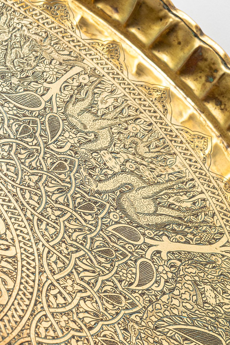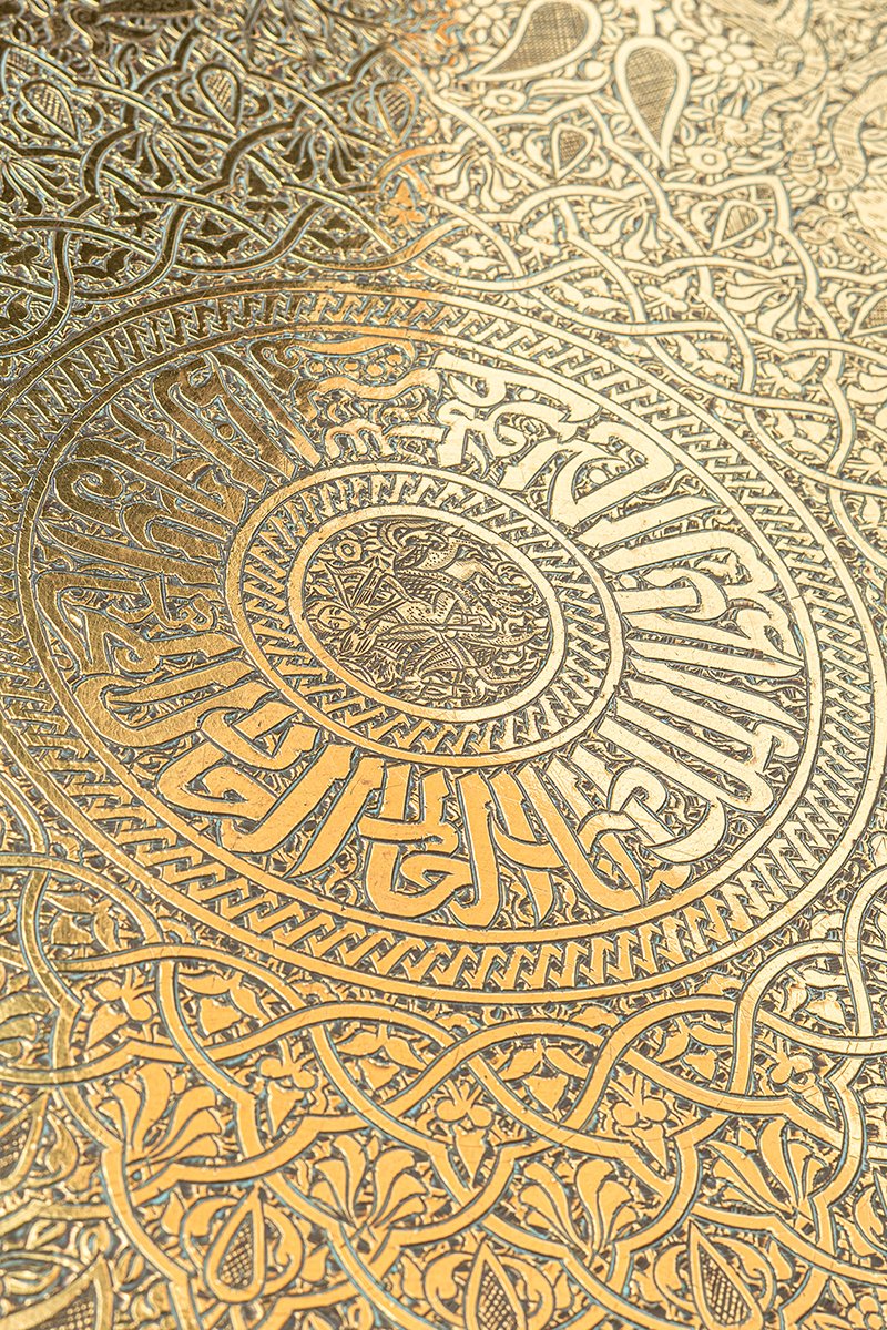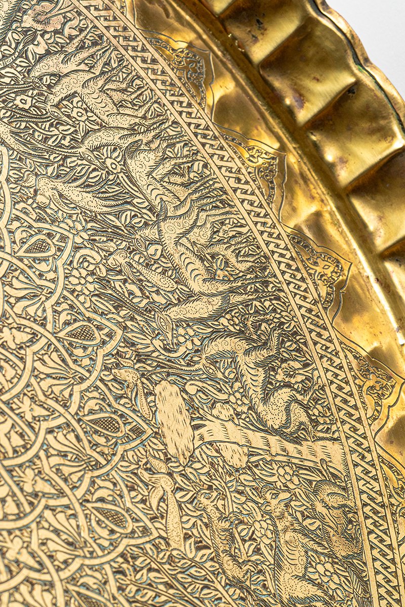 This tray is more than a hunting scene or decorative bestiary; it is a cosmology of rulership. By placing himself at the center, Baybars is depicted as master of both court and creation, protector of divine order mirrored in the natural kingdom. The cycle of beasts, the alternating geometry, and the praises inscribed around him form a proclamation in metal: the Sultan as the axis of justice, strength, and divine stewardship, set within a star-shaped design that reflects the very order of the sky.