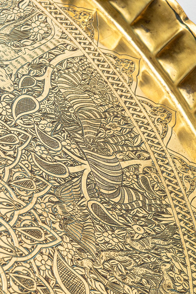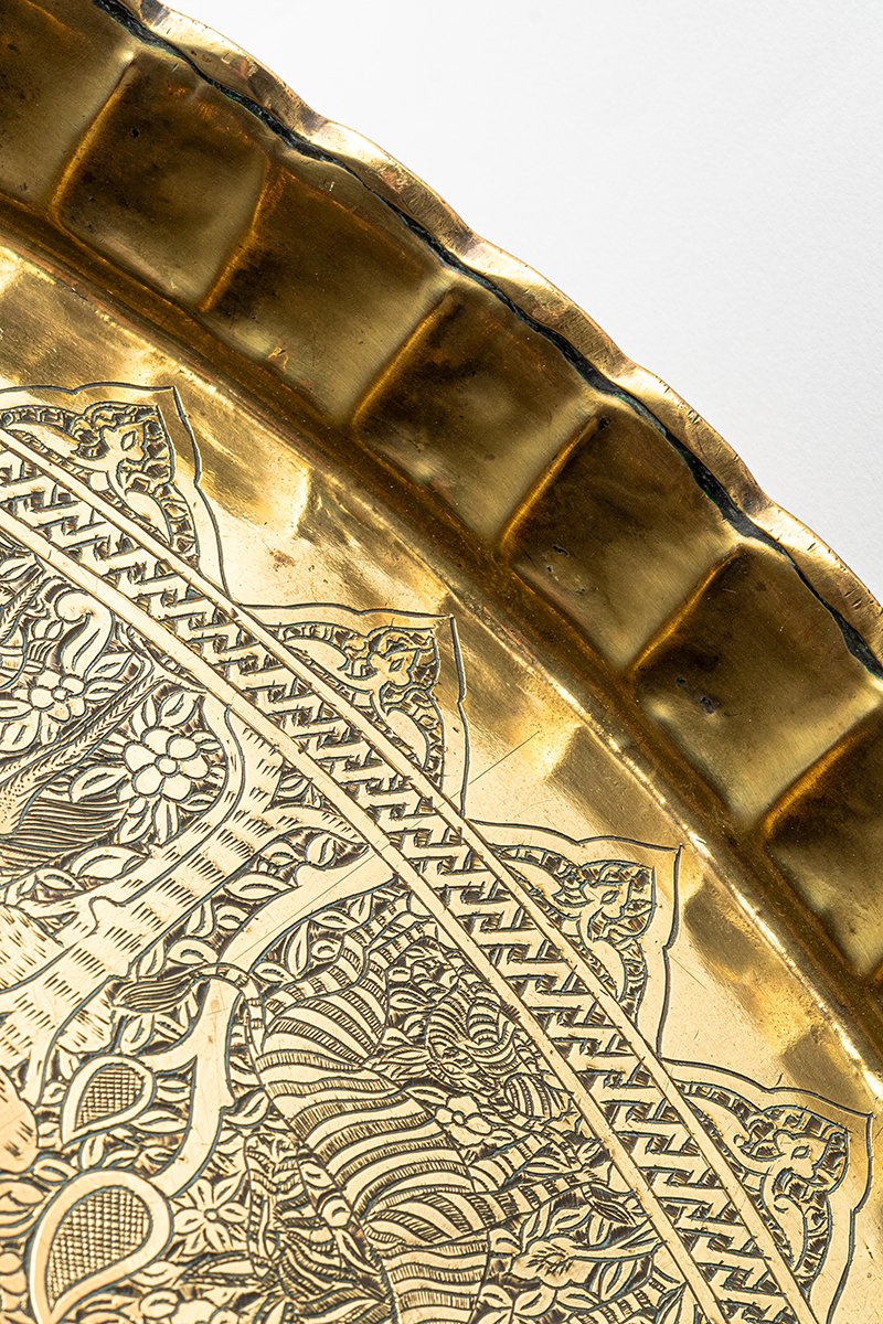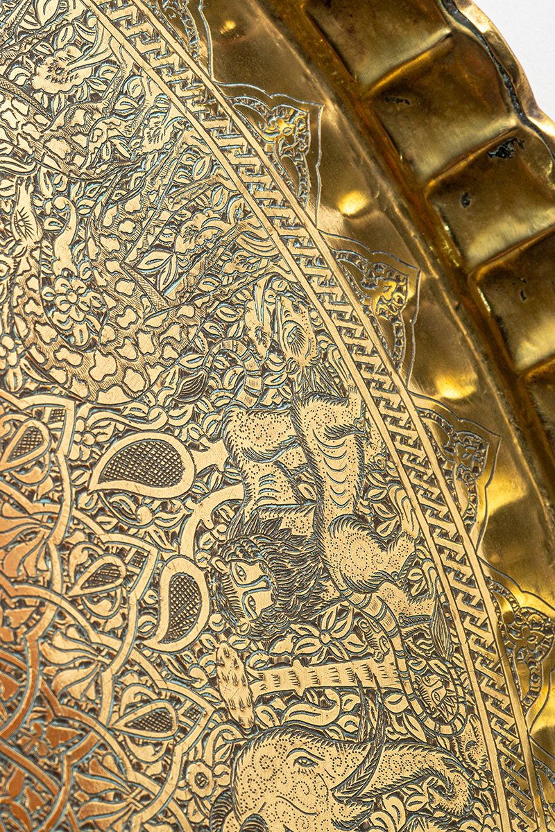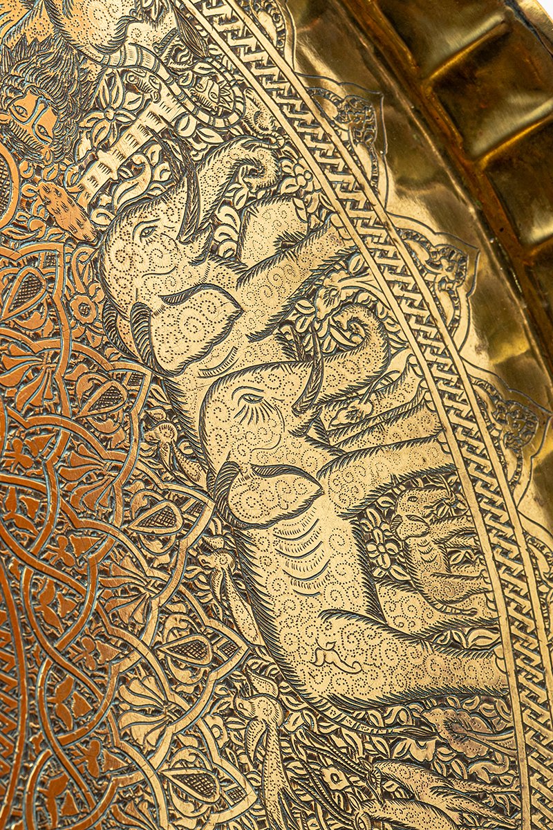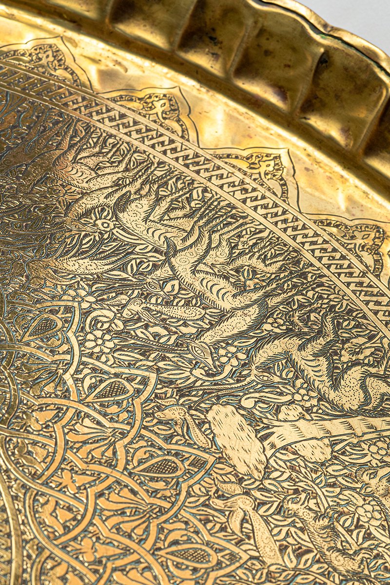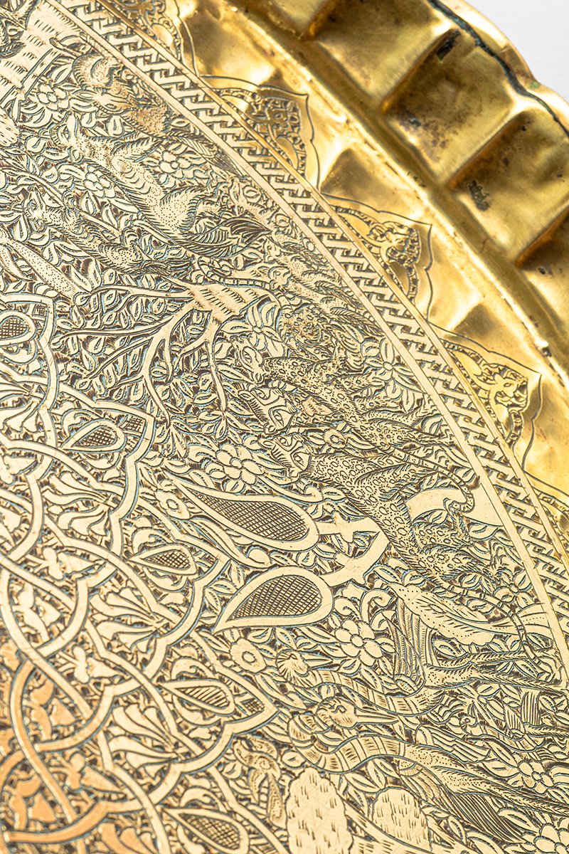 This brass tray unfolds like a living bestiary in metal, a cosmos where script, geometry, and animal life are bound together. At its center lies a sunburst medallion, radiating bands of calligraphy around a circular scene in which a mounted rider dominates, the figure of al-Malik al-Ẓāhir Baybars, the Sultan as both warrior and guardian. From this luminous heart, a dense weave of Mamluk scrollwork and geometry extends outward, enclosing a remarkable ring of wildlife scenes.