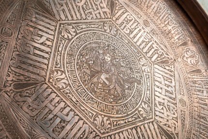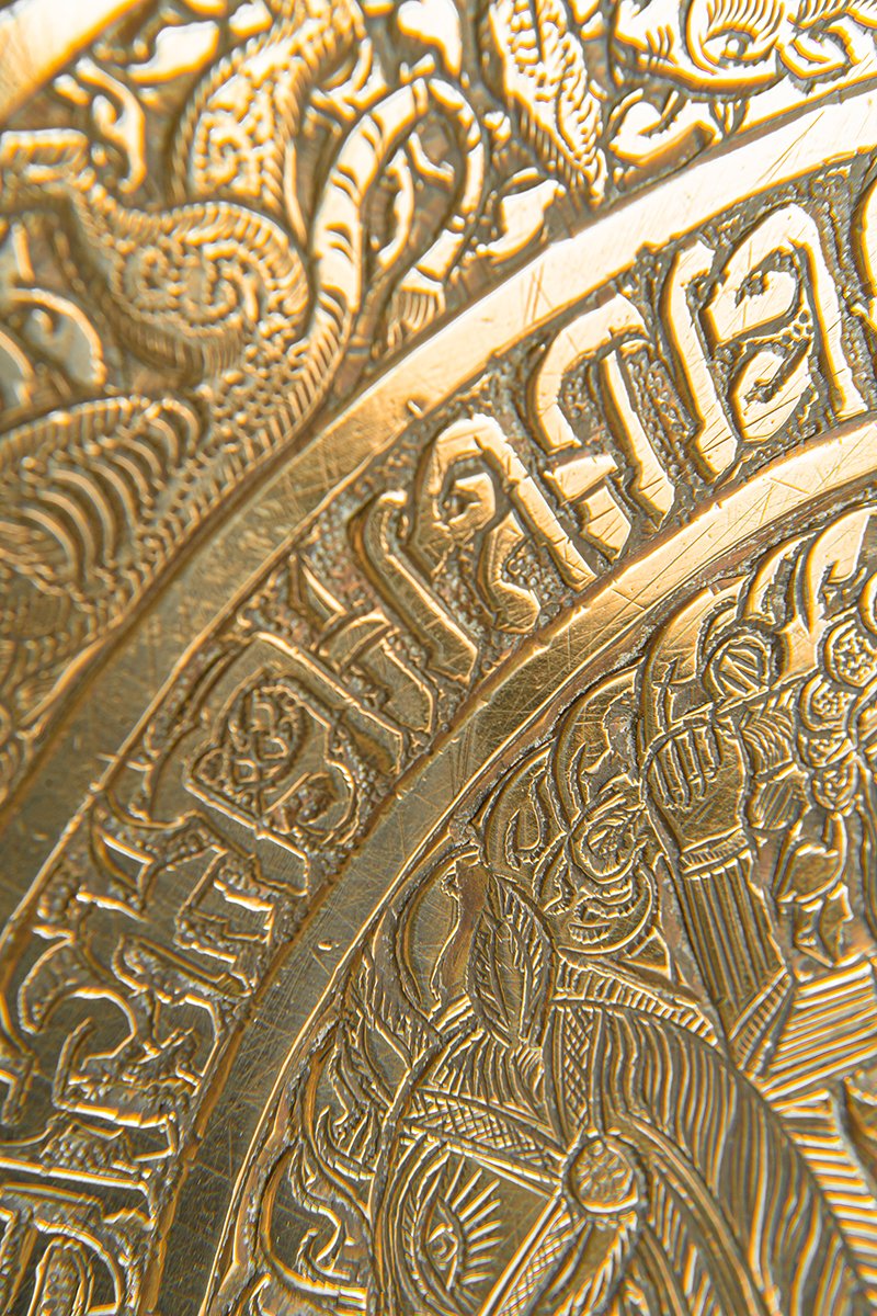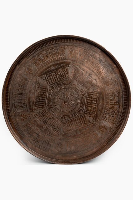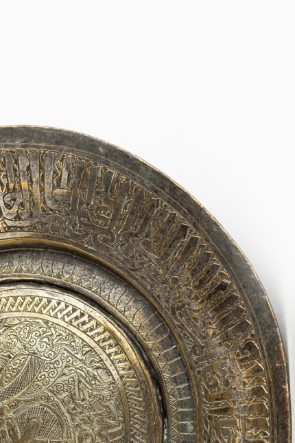 This magnificent brass tray is a masterwork of Mamluk ceremonial metalwork, its vast surface transformed into a tapestry of calligraphy, figural scenes, and allegorical symbolism. With its monumental size and weight, it stands not only as a utilitarian vessel but as a proclamation of prestige, devotion, and authority, a “visual manuscript” in engraved brass.