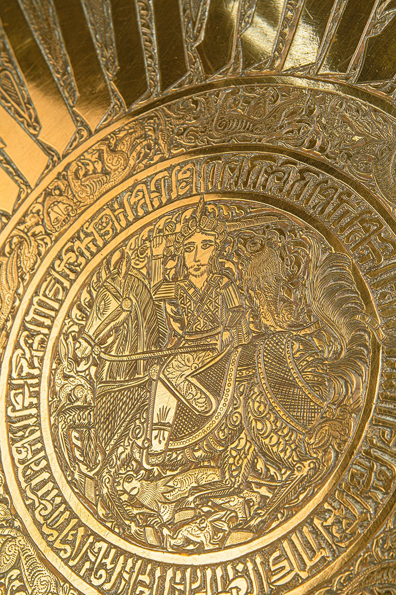 • Central Medallion: At the heart of the tray sits an engraved scene of the Sultan as mounted warrior, surrounded by attendants, beasts, and soldiers. Lions, peacocks, and mythic animals enliven the courtly tableau, symbolizing kingship, guardianship, and cosmic order.