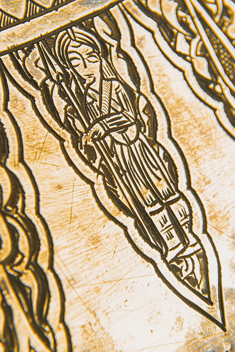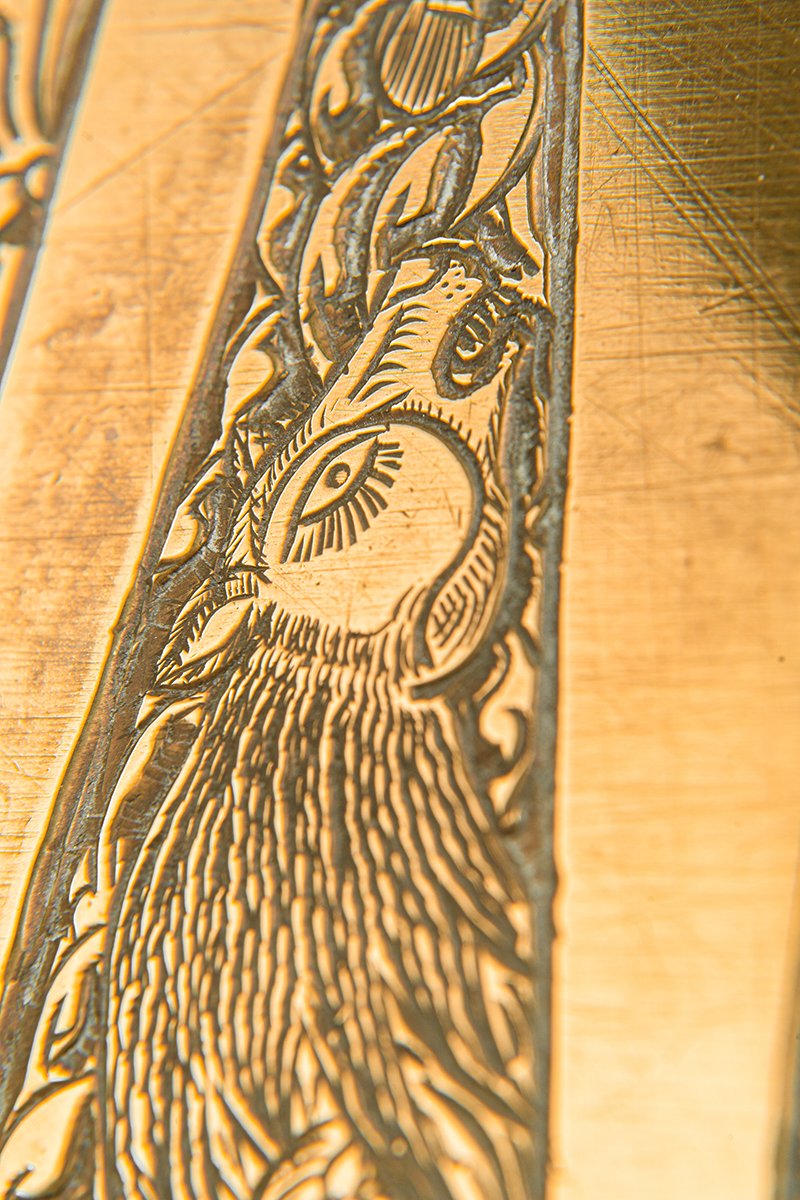 • Surface Finish: The engraved brass, darkened in recesses yet glimmering on raised lines, produces a visual depth that animates the figures and patterns across its monumental field.