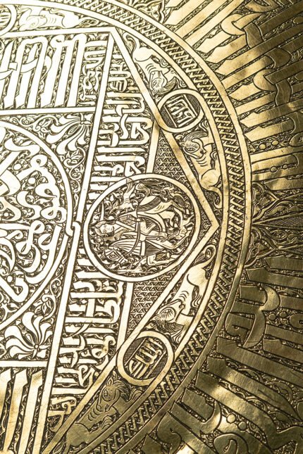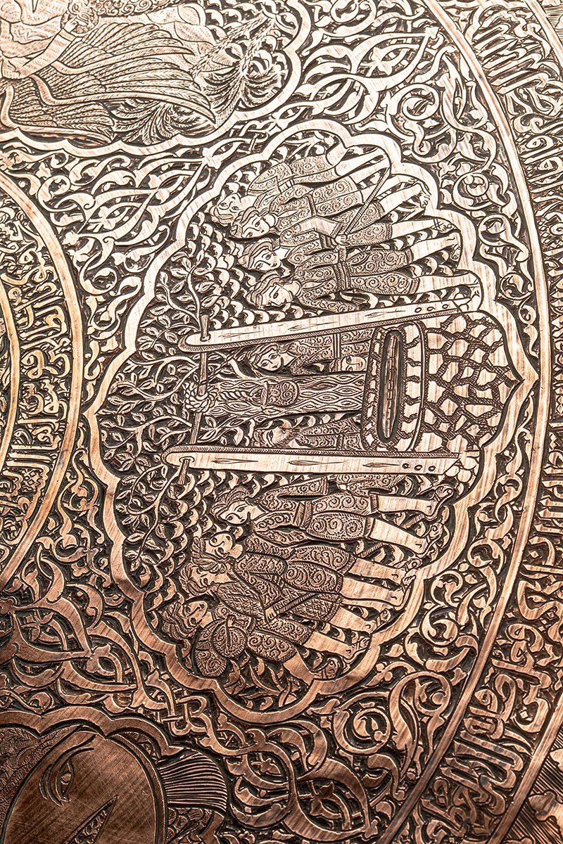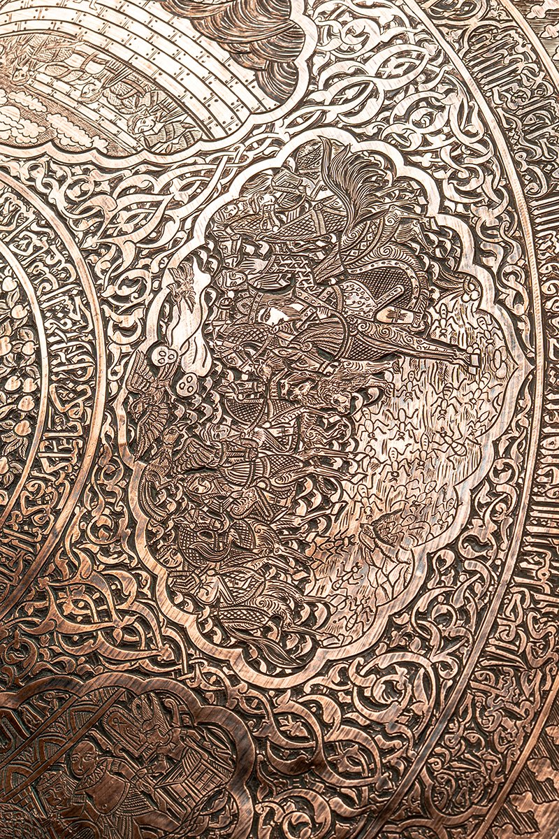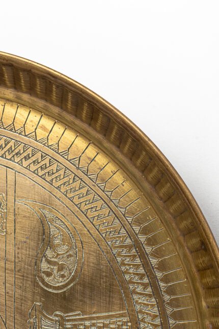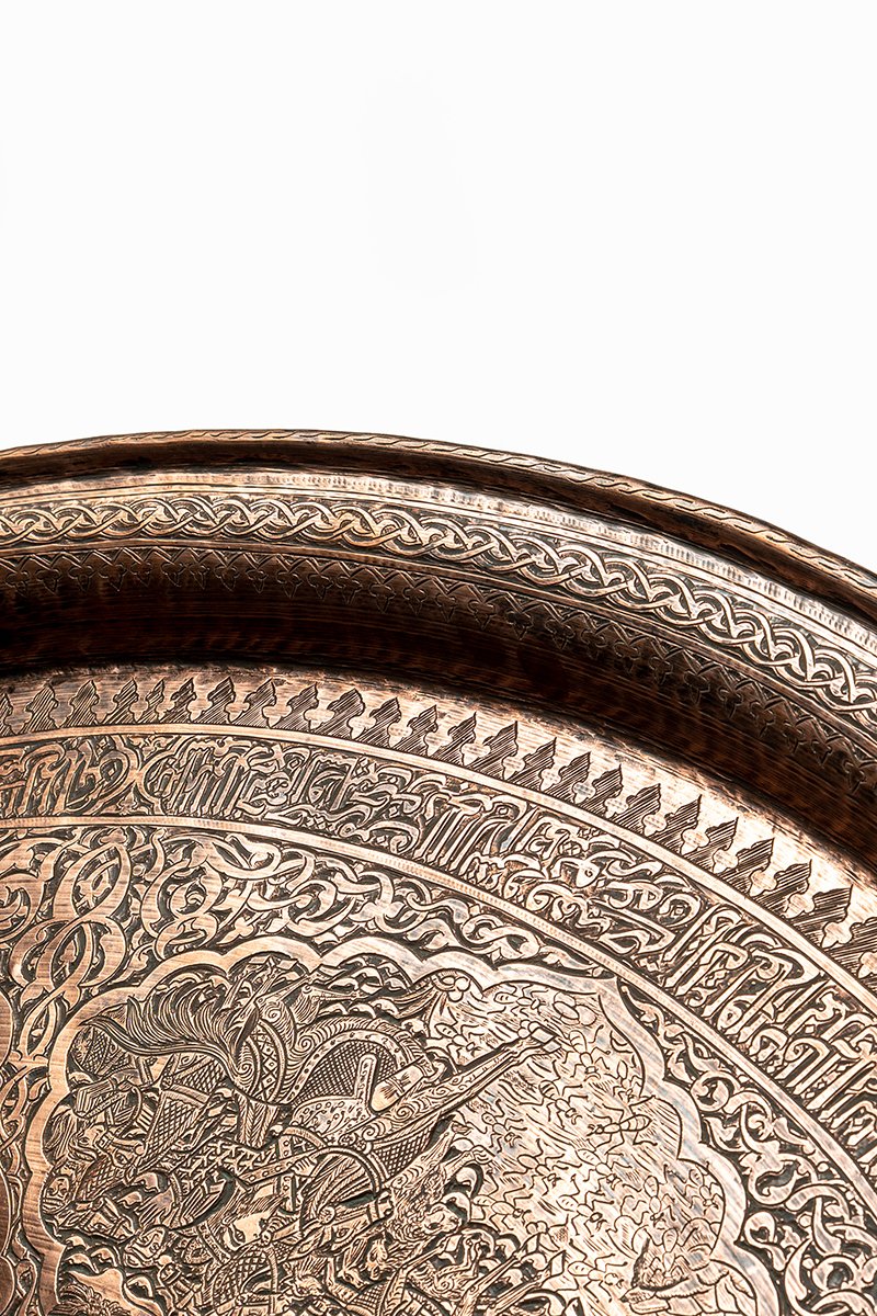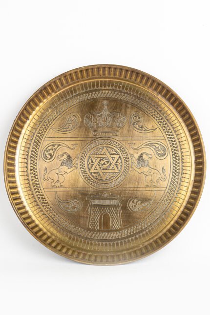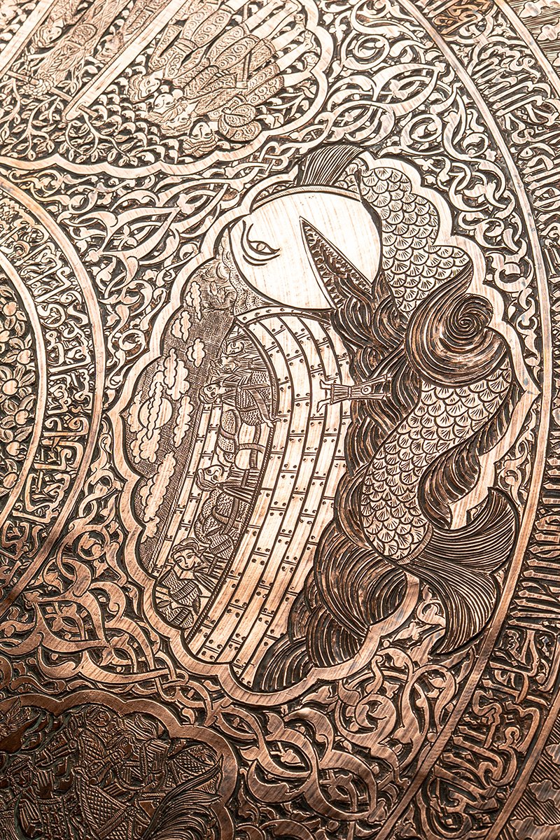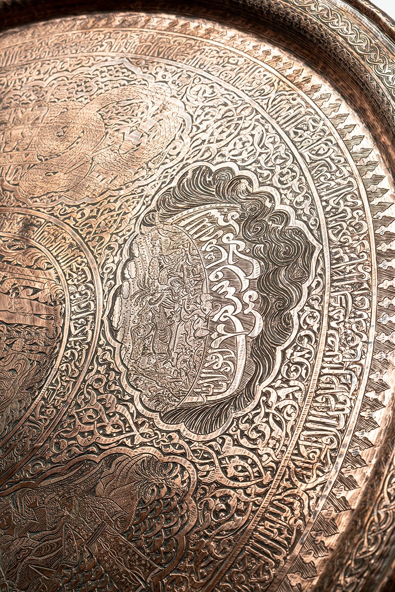 This tray is a metallic scripture, a revelation told in copper. It binds together the earliest stories of humankind, creation, covenant, trial, mercy, kingship, betrayal, and deliverance into a single visual theology. To look upon it is to walk through sacred history: Adam’s trial, Noah’s survival, Abraham’s obedience, Joseph’s betrayal, Jonah’s redemption, Solomon’s dominion, and Moses’ triumph. Inscriptions weave around them like divine breath, while animals and angels enliven the margins. This is no mere ornament but a portable sacred text, where memory, faith, and artistry converge into eternal testimony.