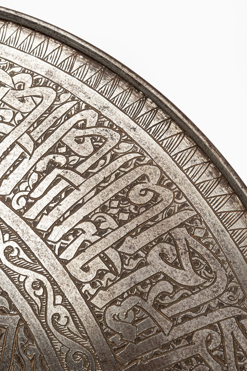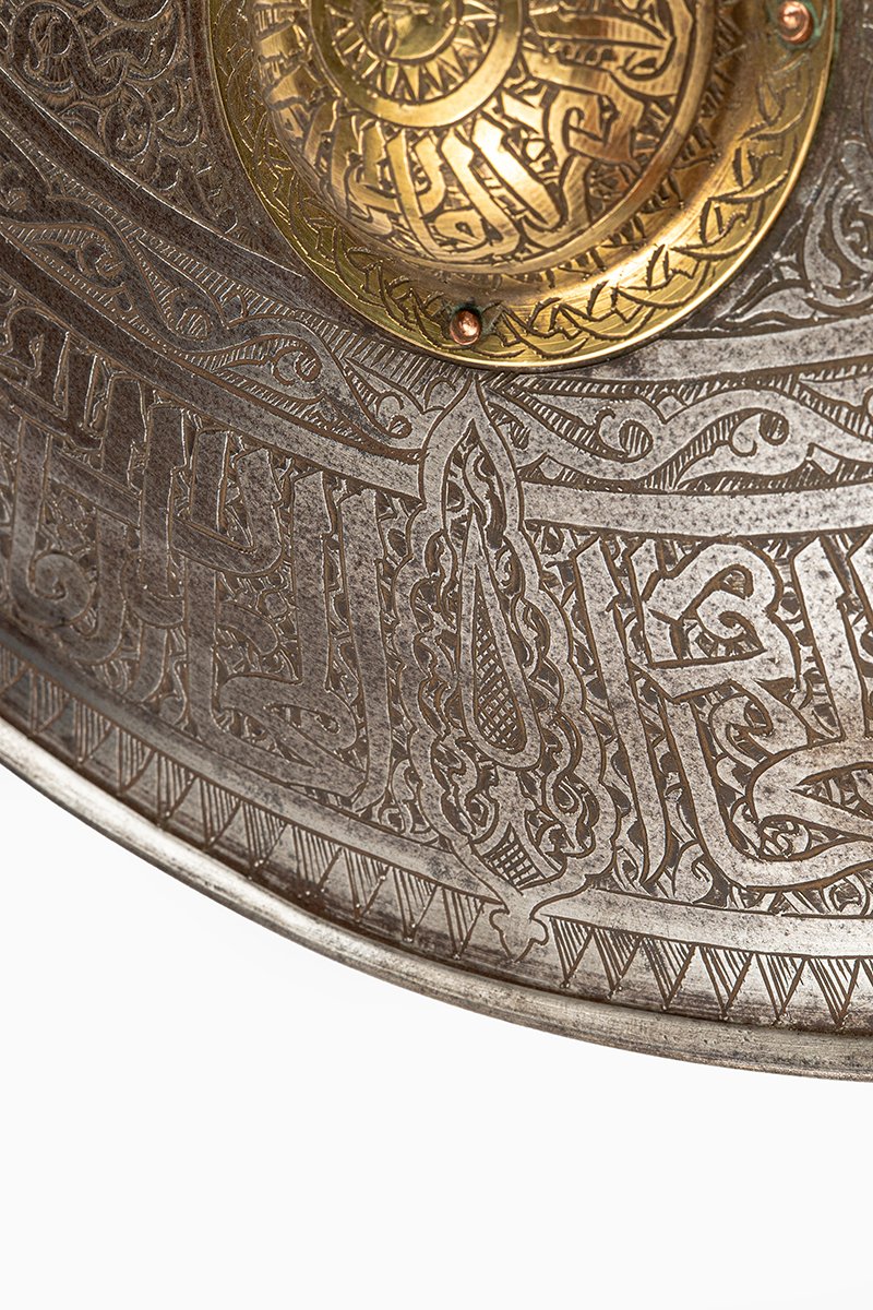 Flowing across the concentric bands are Qur’anic invocations and praises, rendered in bold script that merges text with ornament. Each boss carries its own inscribed invocation, turning the shield into a talisman of protection as much as an instrument of war.