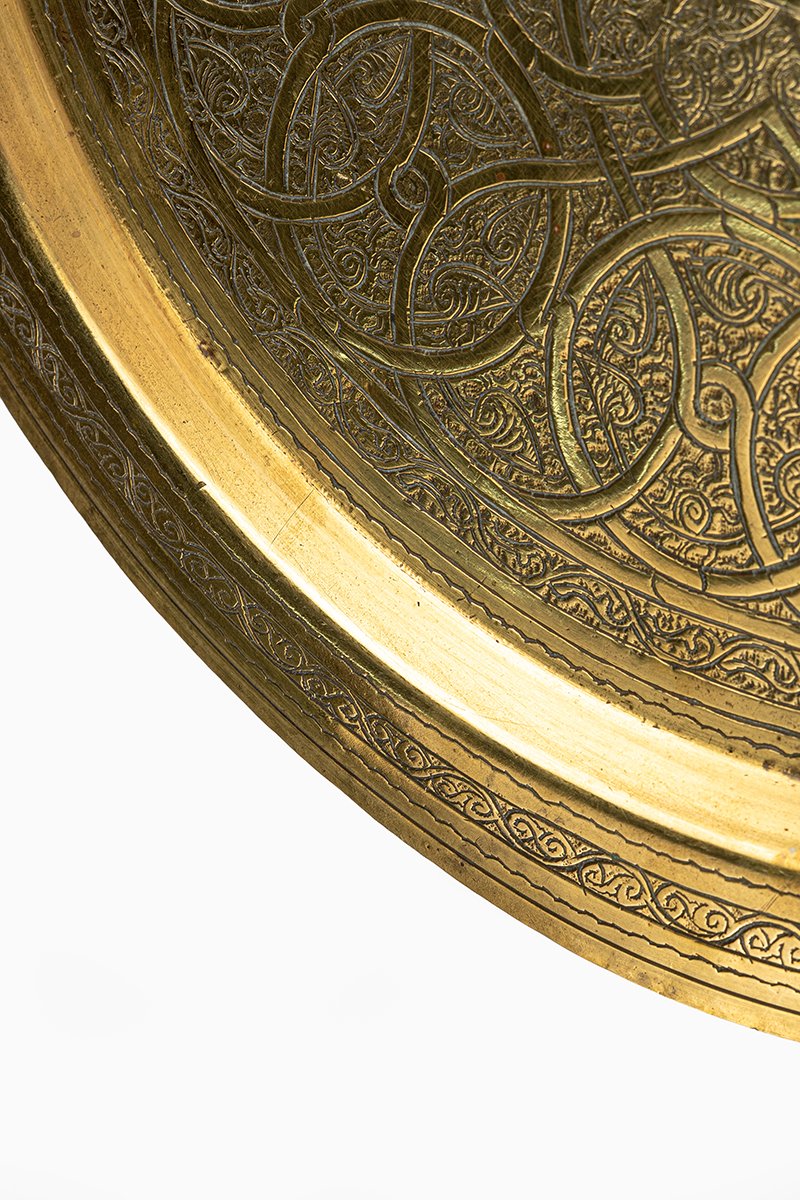 This gilded brass tray is a masterwork of Islamic metalcraft, where calligraphy, geometry, and vegetal ornament are woven into a single surface of devotion and artistry. Its gleaming golden finish transforms it into both a functional vessel and a radiant object of contemplation.
