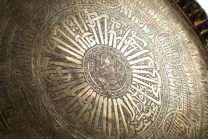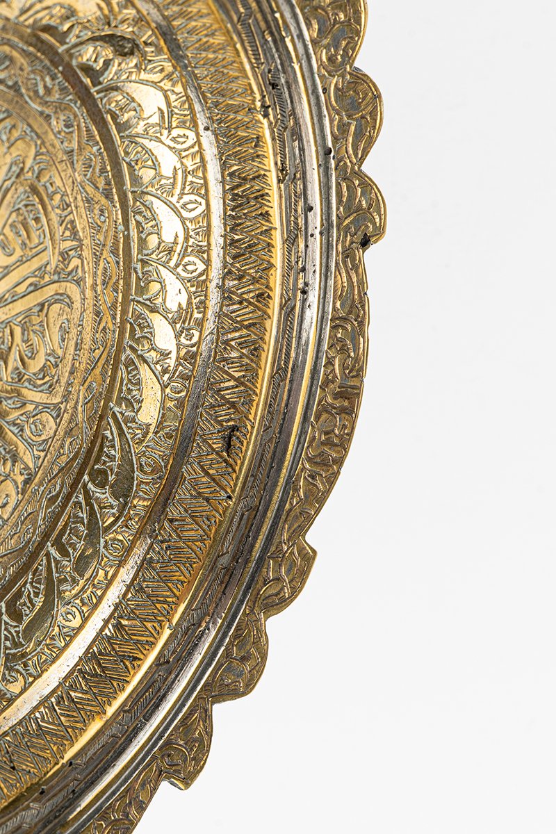 - Scalloped Rim: The broad rim carries further inscriptions and arabesque motifs, framed by scalloped edges that recall floral petals or celestial waves.