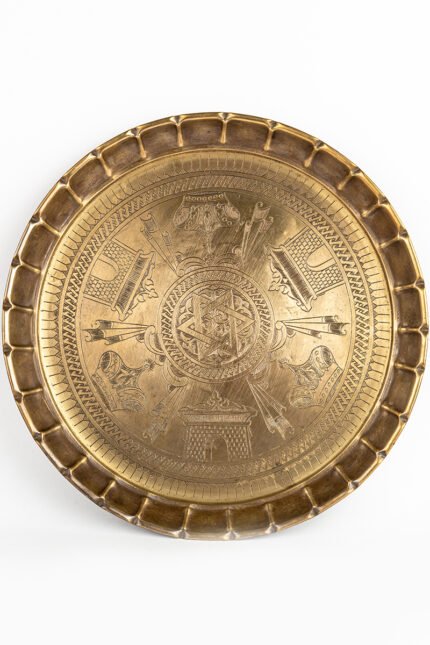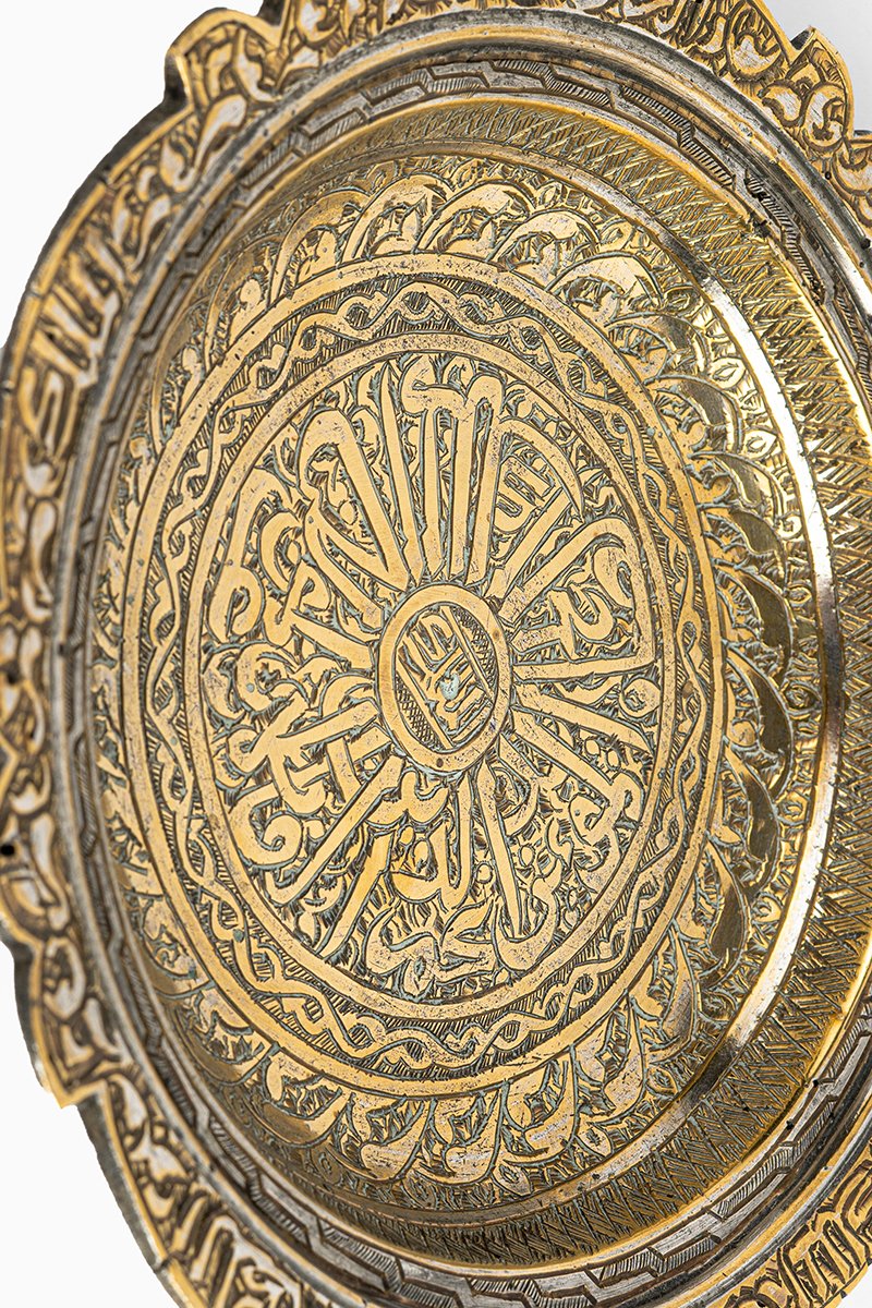 This exquisite brass charger, with its scalloped rim and radiating medallion, exemplifies the refined artistry of Fatimid–Mamluk metalwork. Its surface combines geometry, calligraphy, and vegetal ornament into a vision of cosmic harmony, where decoration becomes devotion.