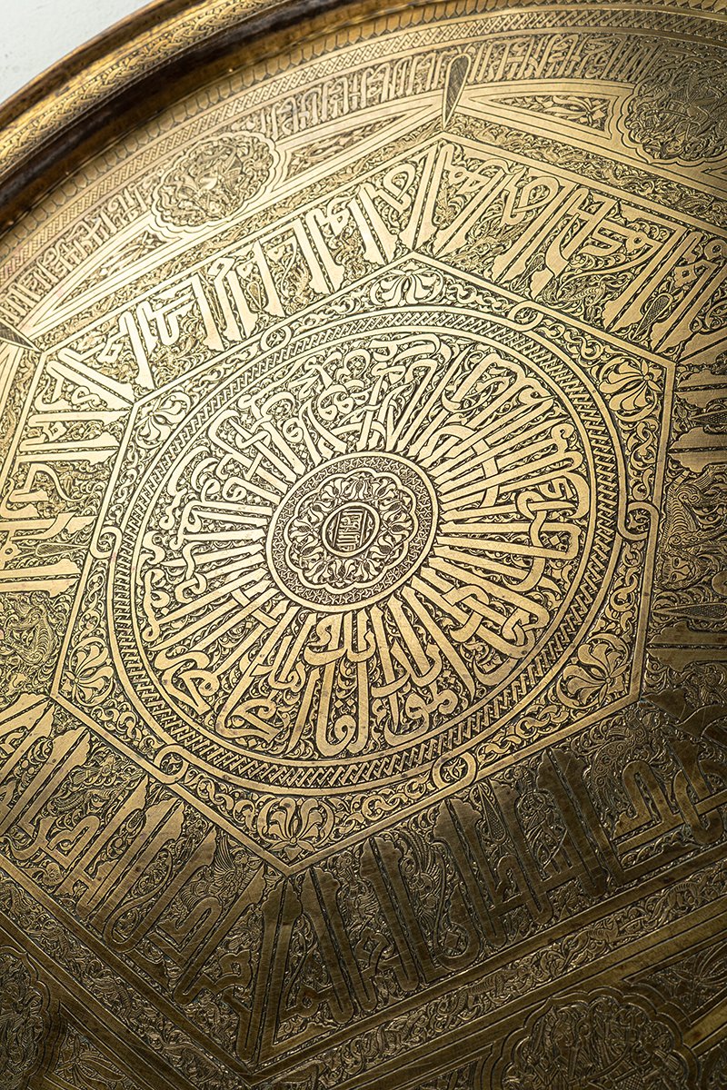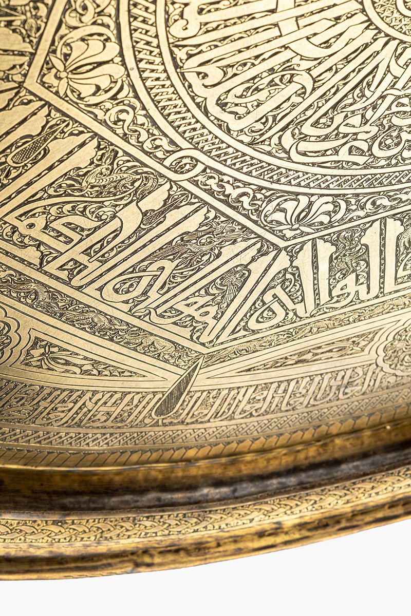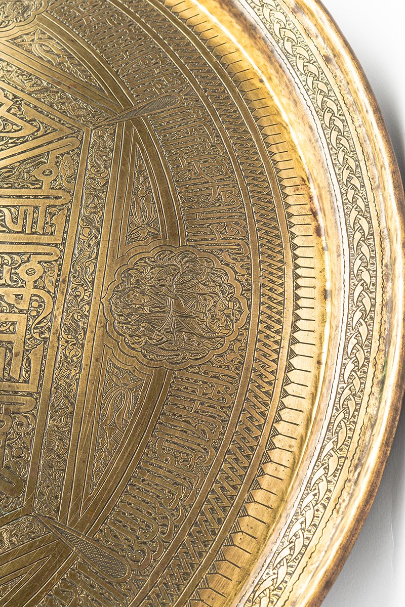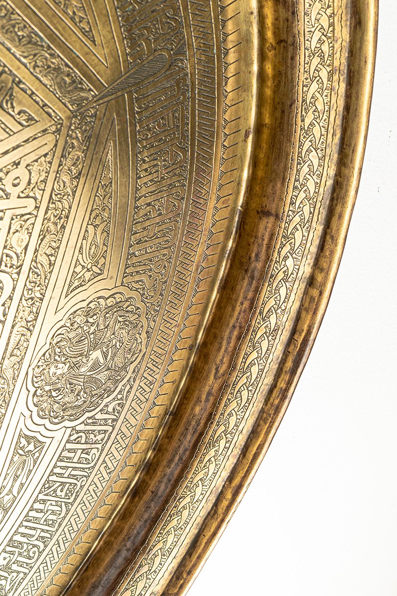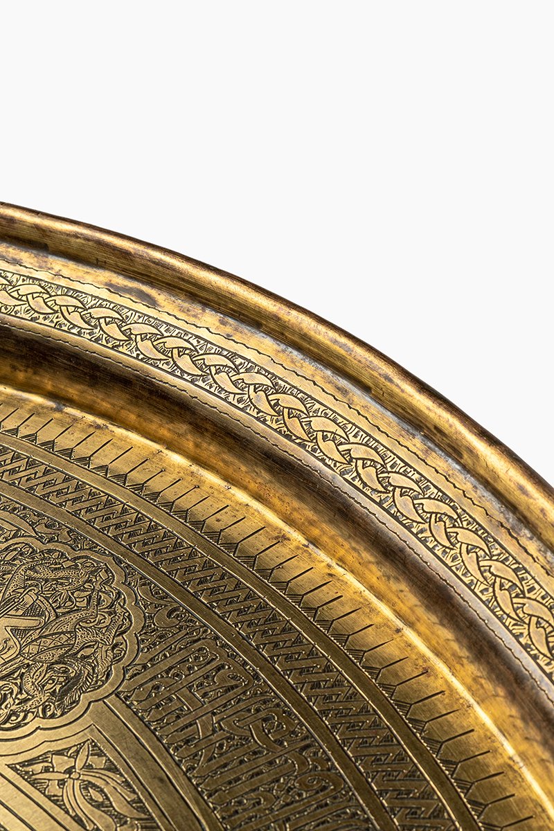 This tray is less a vessel than a mandala of rulership, where geometry, faith, and life converge. At its heart, the Sultan’s seal radiates authority; around him, sixfold guardianship of warriors and princes. The Kufic script embodies permanence, yet its letters are alive with beasts and birds, while the Mamluk inscriptions at the base elevate the work into dynastic continuity. The result is a cosmic proclamation of protection and dominion: word, beast, and geometry locked together into a vision of eternal sovereignty.