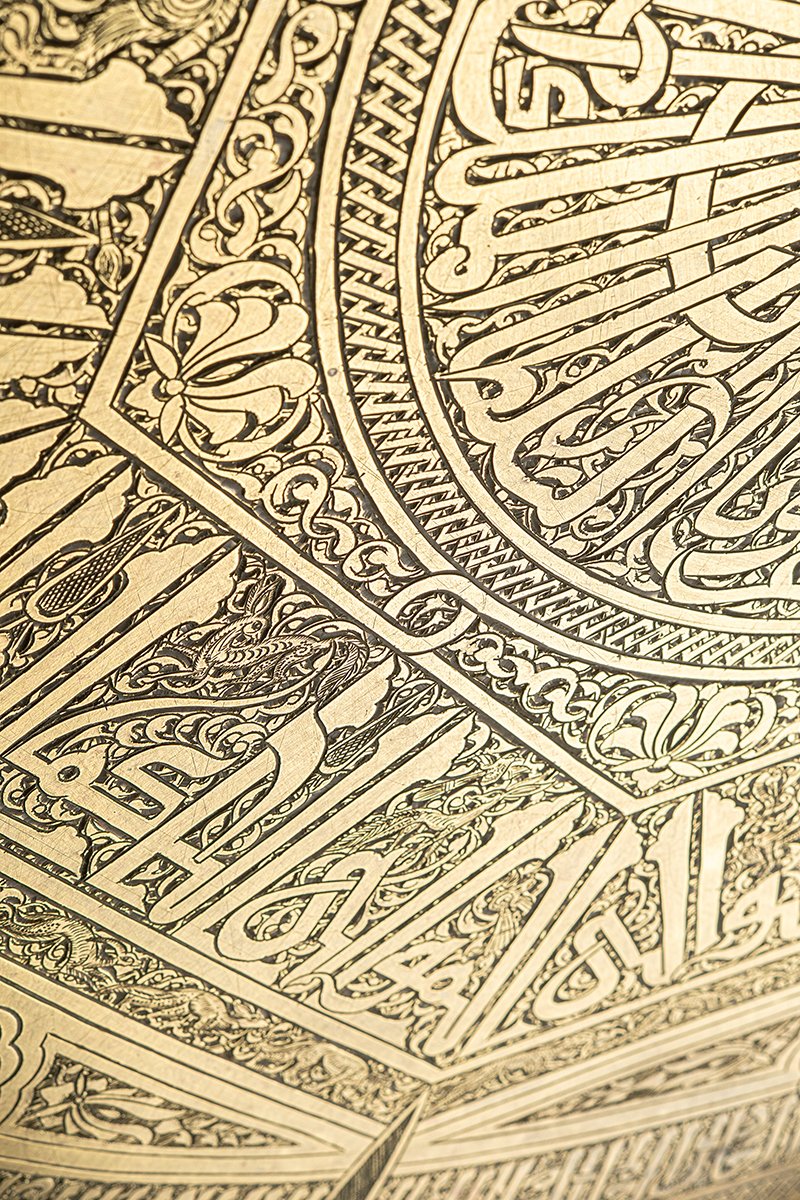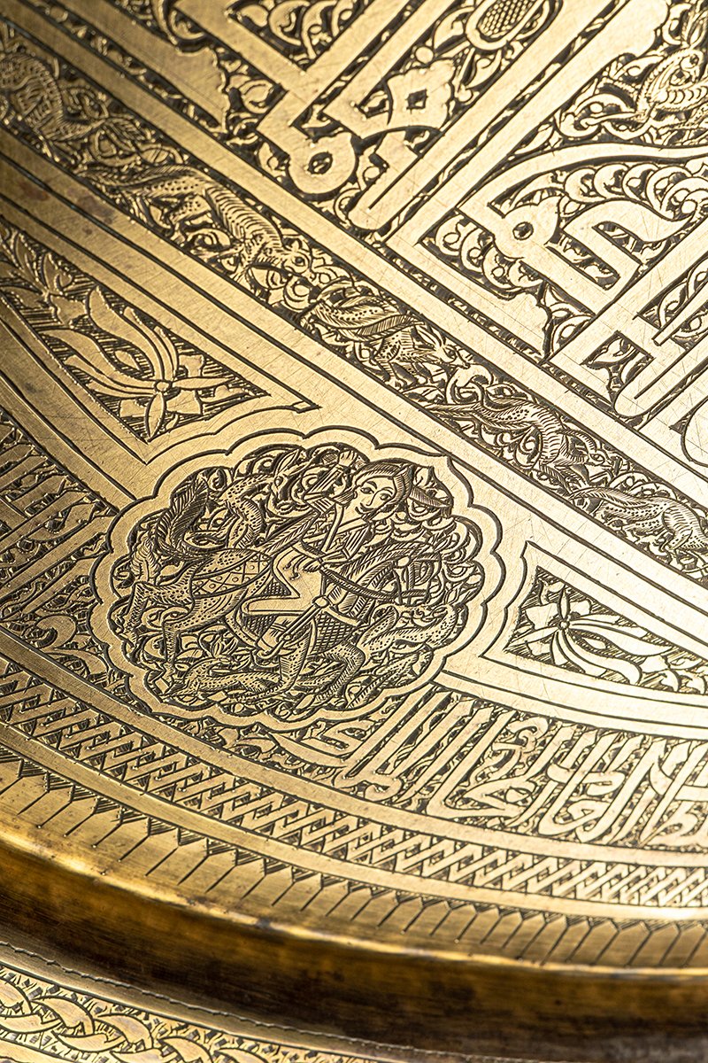 - Kufic & Mamluk Calligraphy: The tray masterfully combines two traditions: bold Kufic script in the central and middle bands, intersecting with animal and bird forms, and Mamluk calligraphy in the outer zones, denser and more decorative, anchoring the composition.