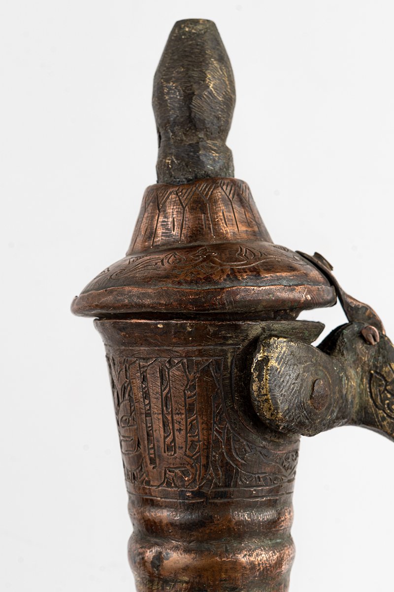 This tall, elegant ewer, crafted in copper alloy, is a vessel where utility meets ceremony, its form and surface transformed into a proclamation of refinement and power. The body swells in rounded fullness before tapering into a slender neck, crowned with a hinged lid that speaks of ritual function. Every surface is inscribed with detail, making the piece not only a jug for pouring but a manuscript in metal.