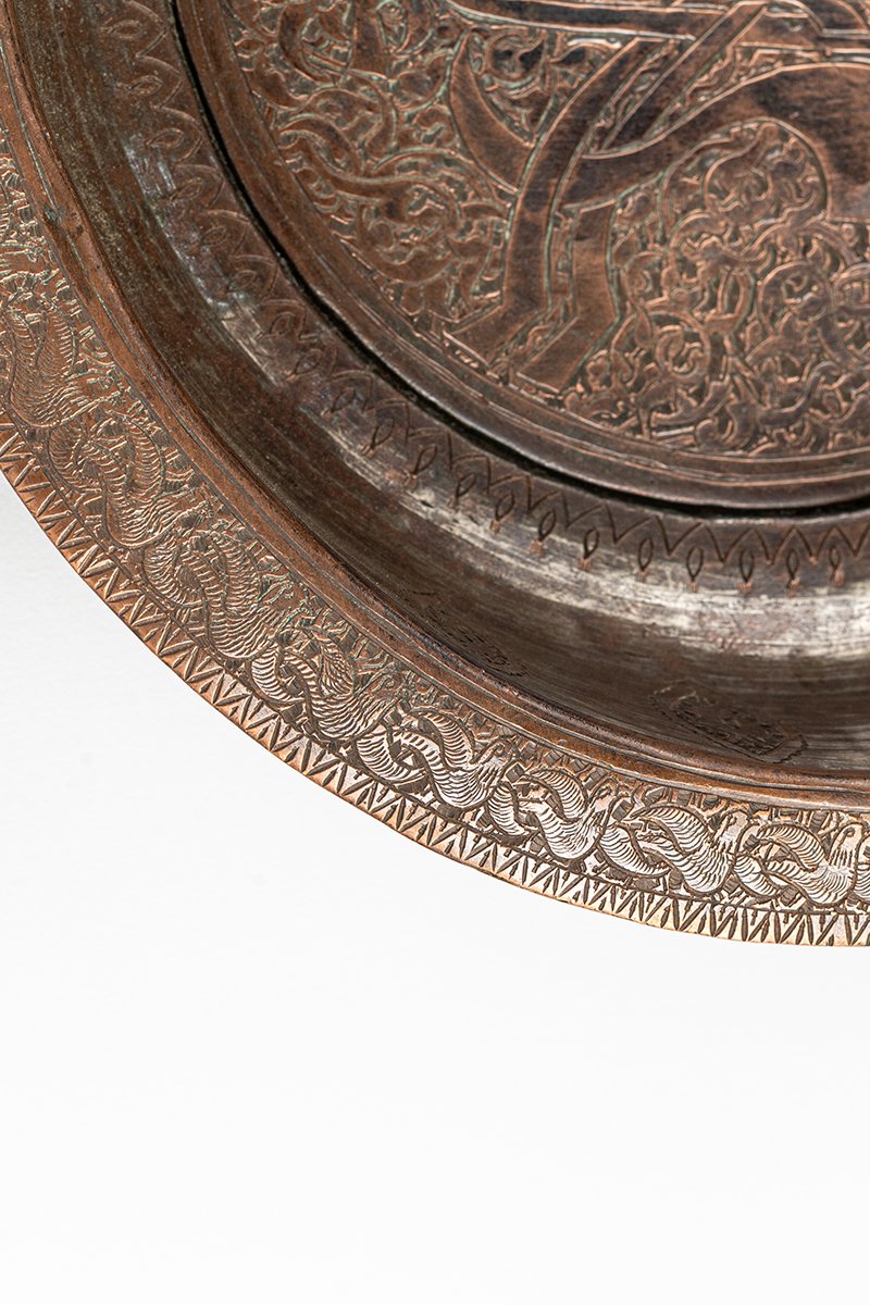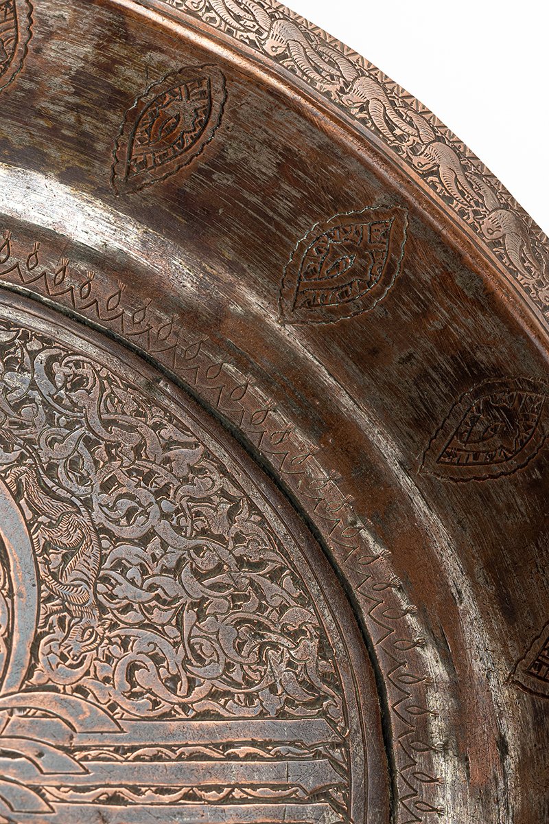 This tray is not merely functional but ceremonial and symbolic. The central tughra proclaims sovereignty; the lion embodies guardianship and majesty; the fox brings earthly wisdom; and the birds symbolize freedom and spiritual vitality. Bound together by arabesques and inscriptions, the tray becomes a visual manifesto of power, protection, and divine order in Ayyubid–Ottoman style.