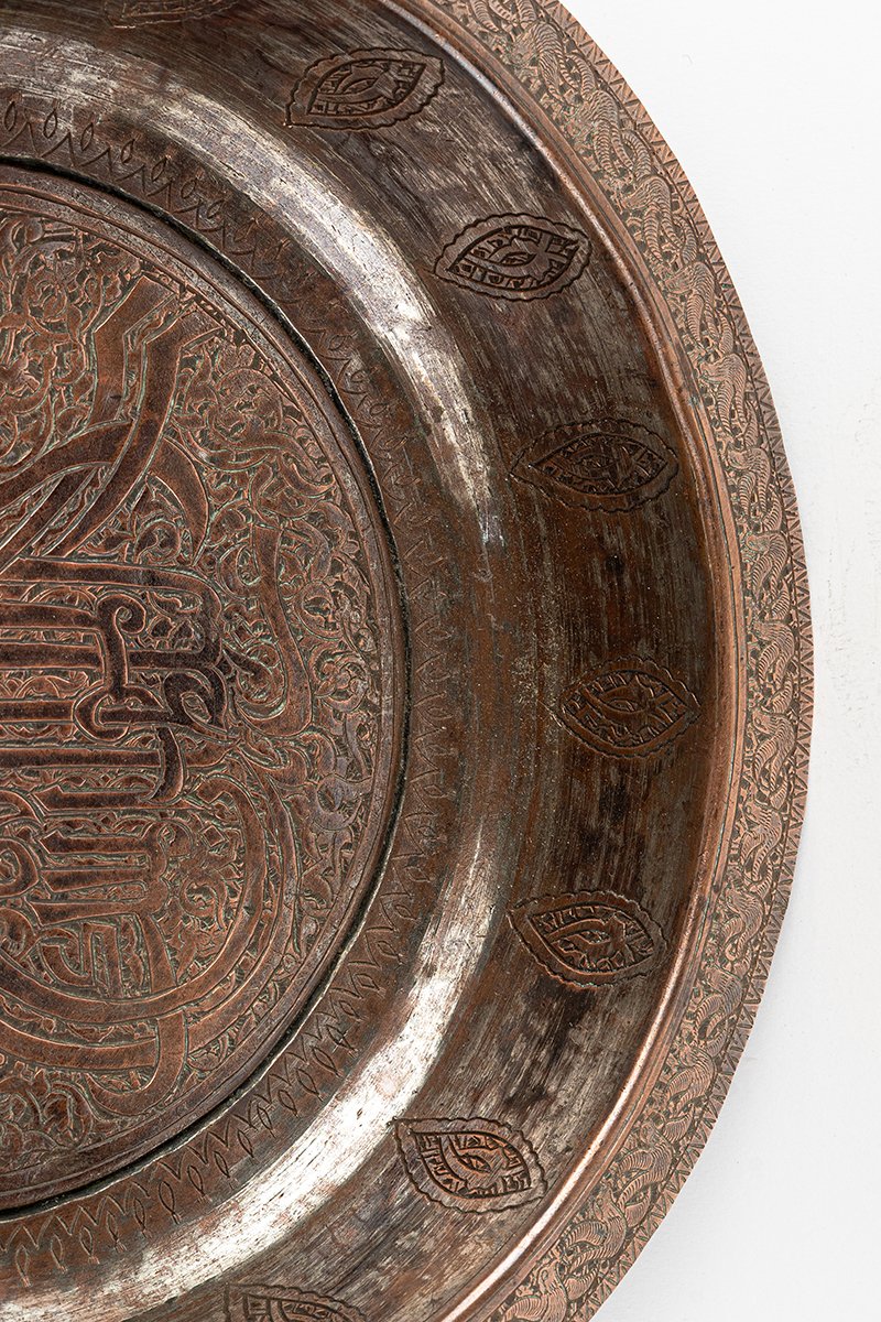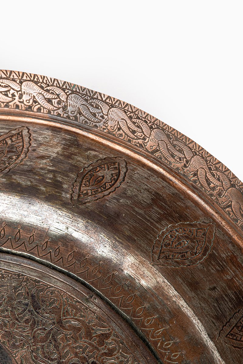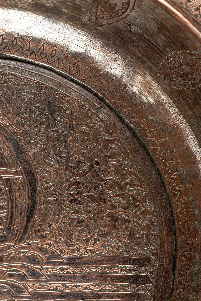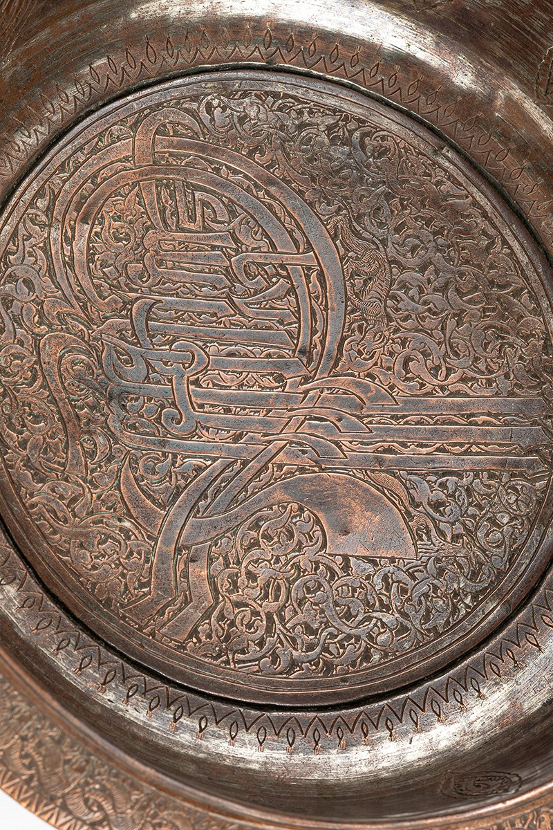 This copper ceremonial tray is a commanding work of imperial artistry, its surface dominated by a bold Ottoman tughra, the calligraphic emblem of sovereignty. Drawn in sweeping verticals and curves, the tughra anchors the tray as a proclamation of divine legitimacy and royal power. Around it unfurls a dense tapestry of arabesques, where vines and blossoms coil in endless rhythm, embodying creation’s eternal order.
