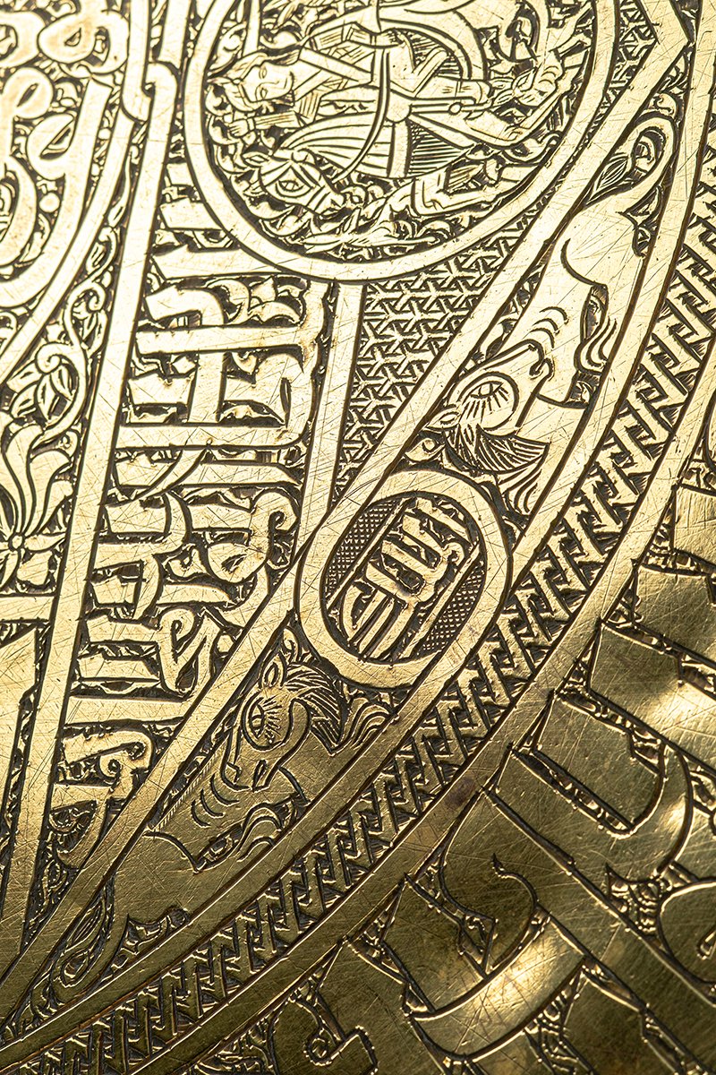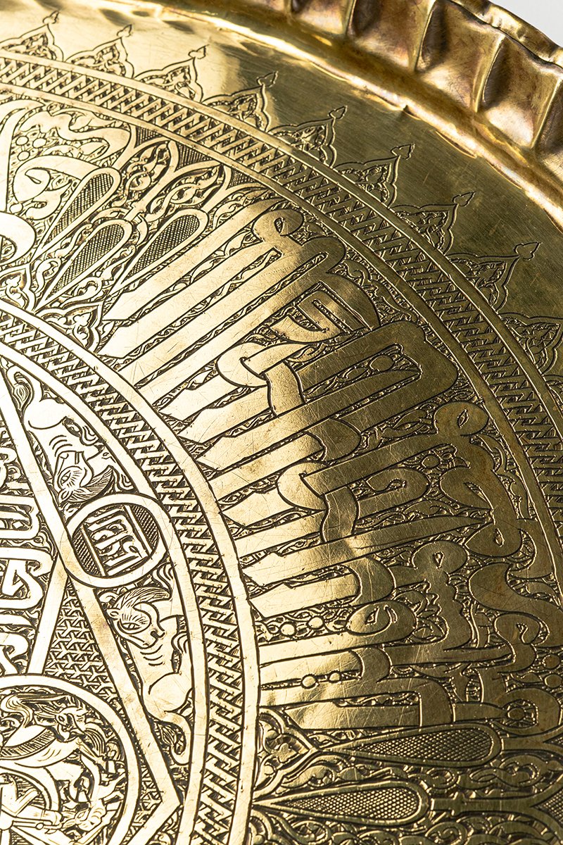This tray embodies the essence of Mamluk sovereignty: the Tughra as seal of legitimacy, the knightly image of Baybars as living ruler, the lions and shields as guardians of kingdom and faith, and the star-geometry as cosmic order. It is both a proclamation and a protection, a declaration that Baybars’ rule was fortified by justice, strength, and divine favor. Viewed as a whole, the tray becomes a radiant mandala of kingship, where script, beast, and geometry orbit around the enduring presence of the Sultan.