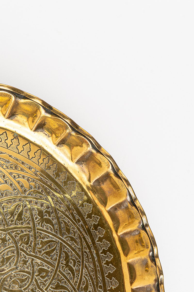 This brass tray is a dazzling study in geometry and artistry, its surface alive with interwoven lines that form a tapestry of infinite pattern. The design channels Fatimid and Ottoman decorative traditions, where mathematics and spirituality converge, transforming metal into a vision of eternity.