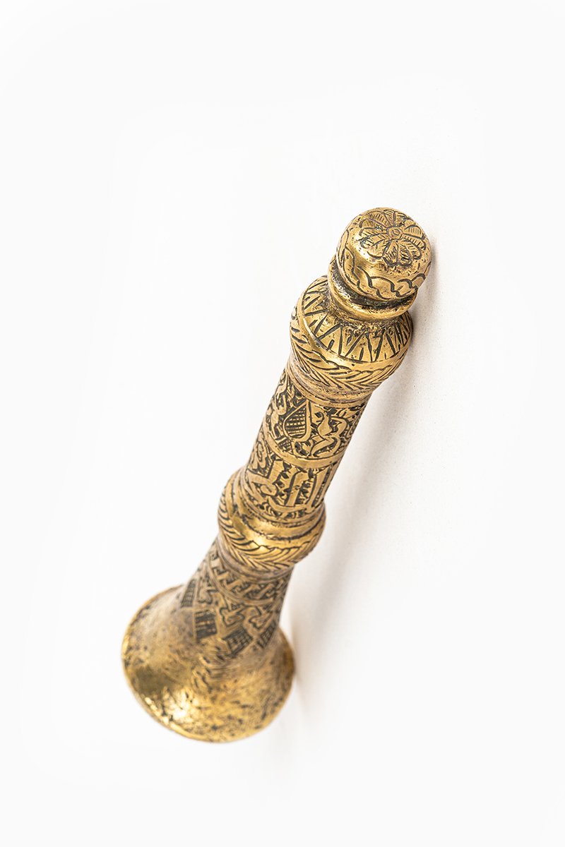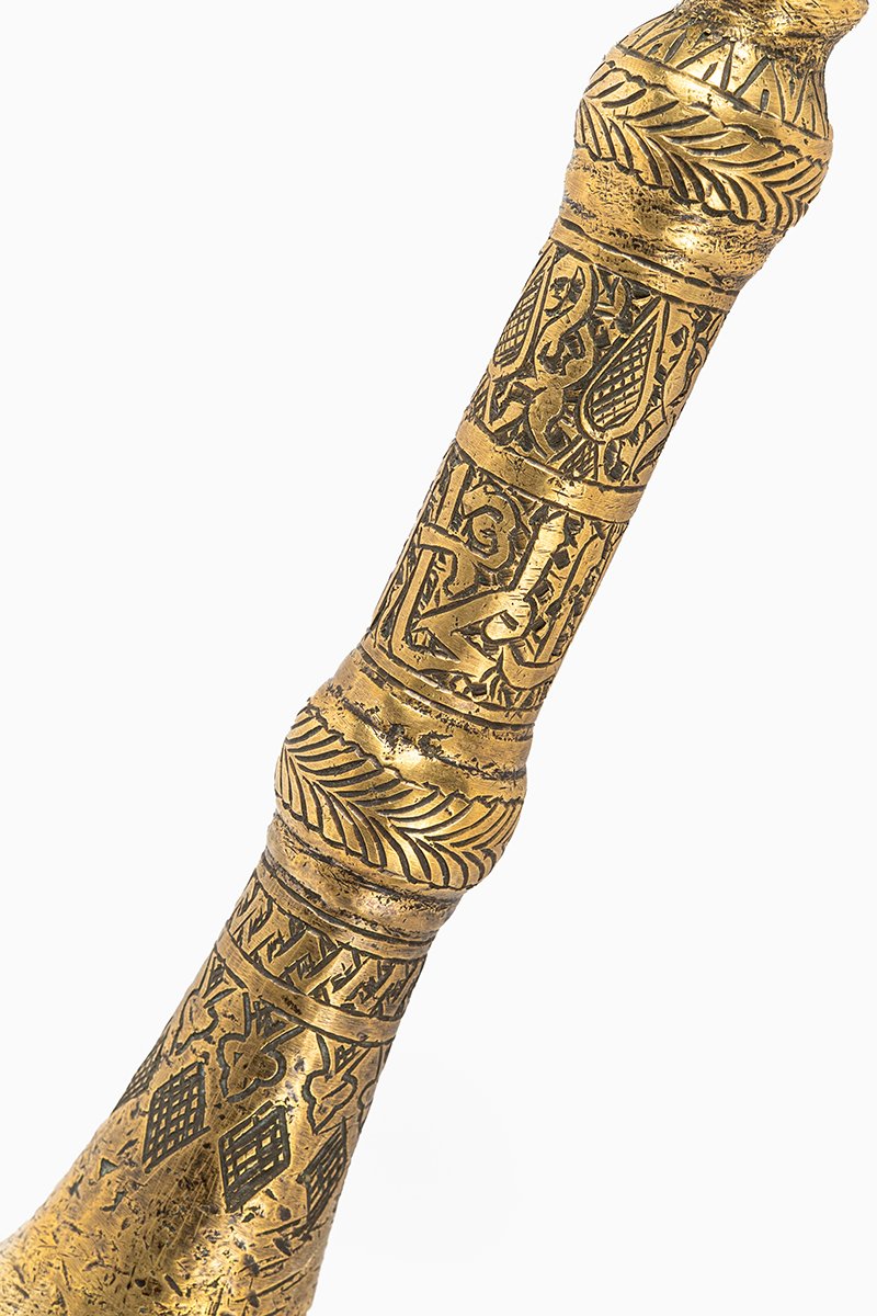 - Pestle: The flared pestle is engraved with interwoven arabesques, calligraphy, and floral medallions, matching the vessel in artistry.